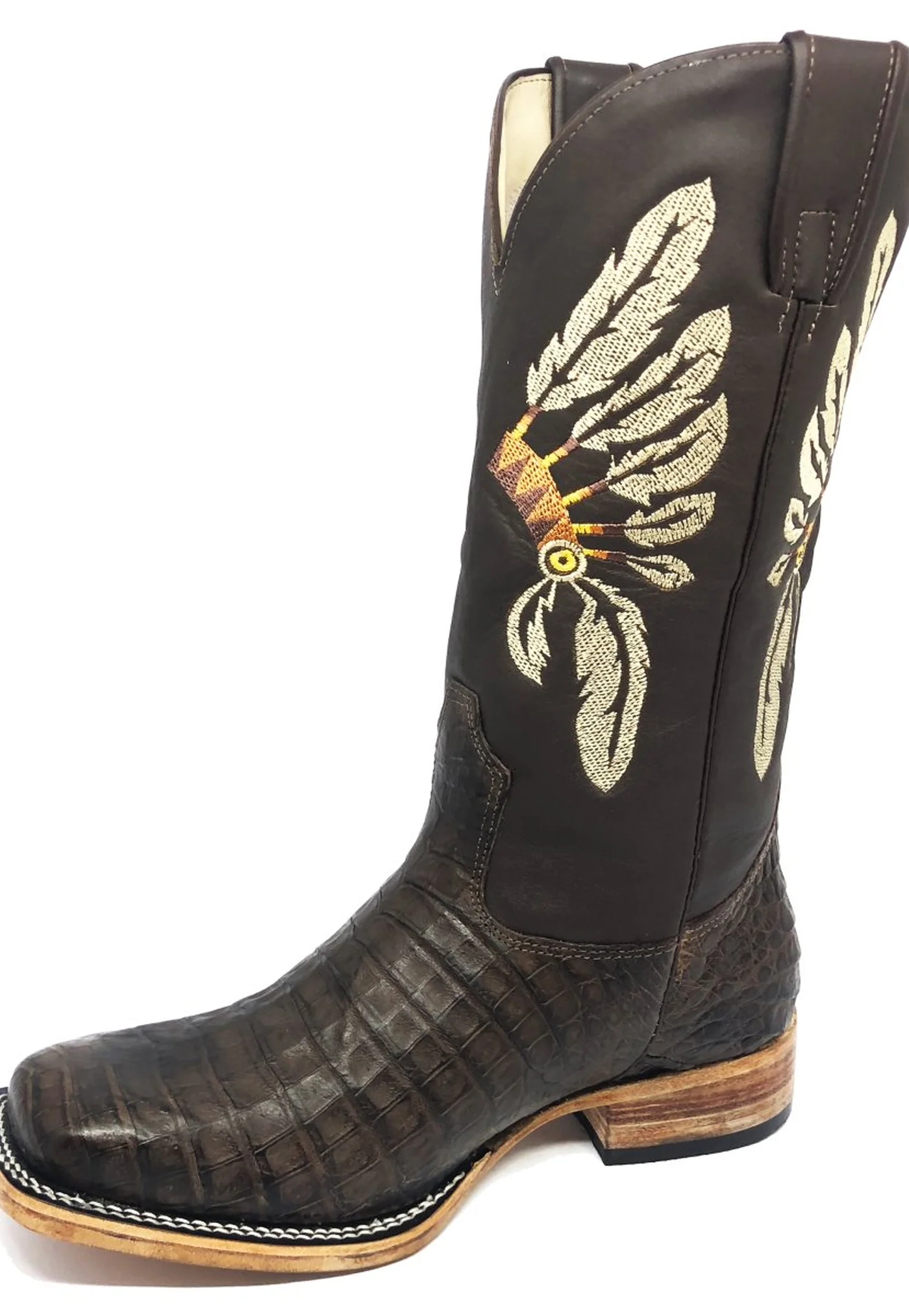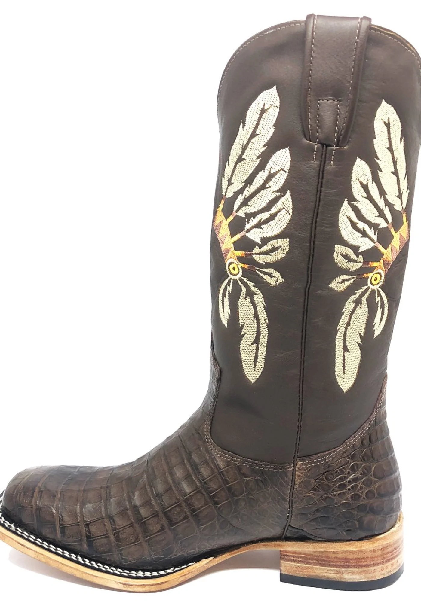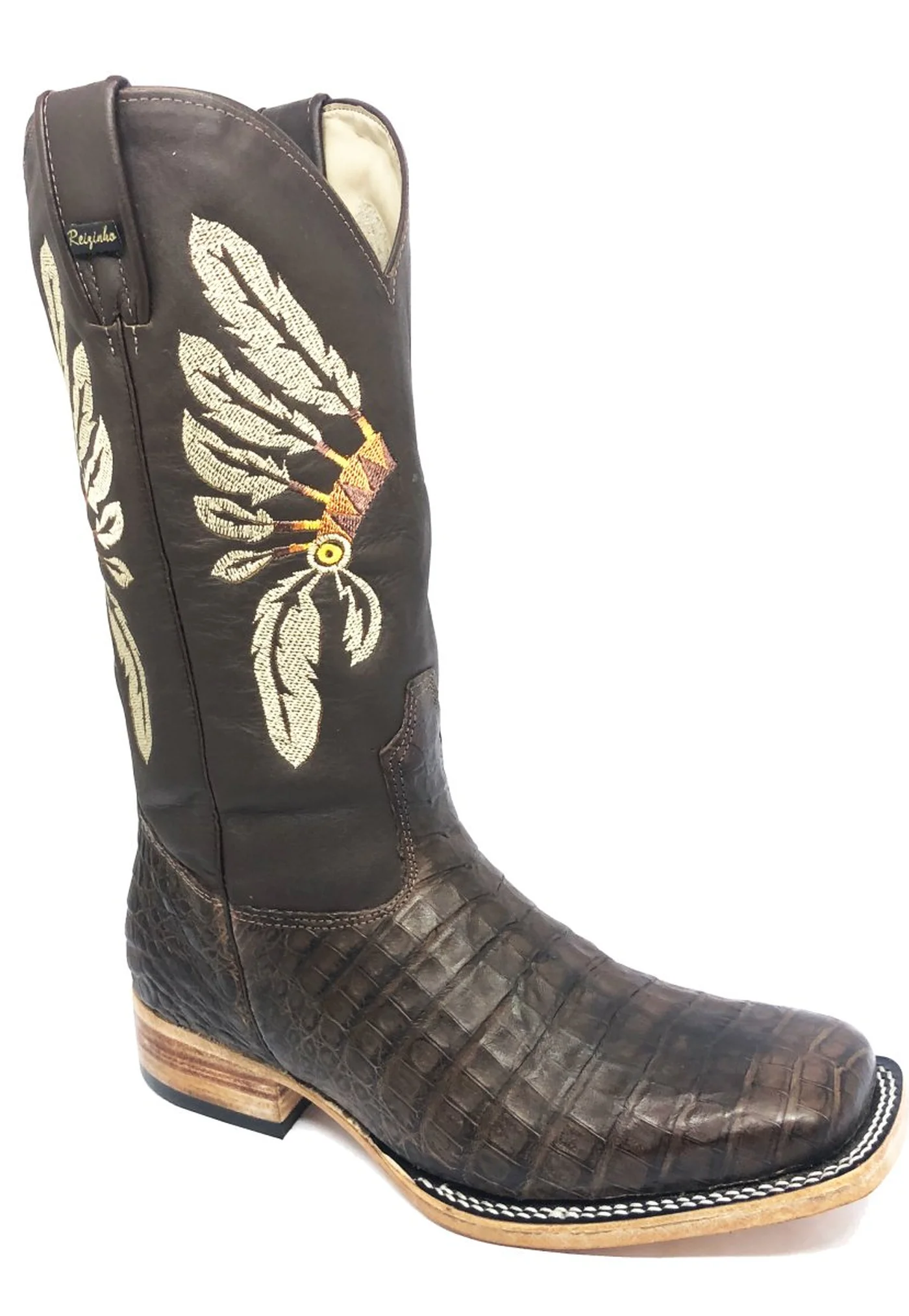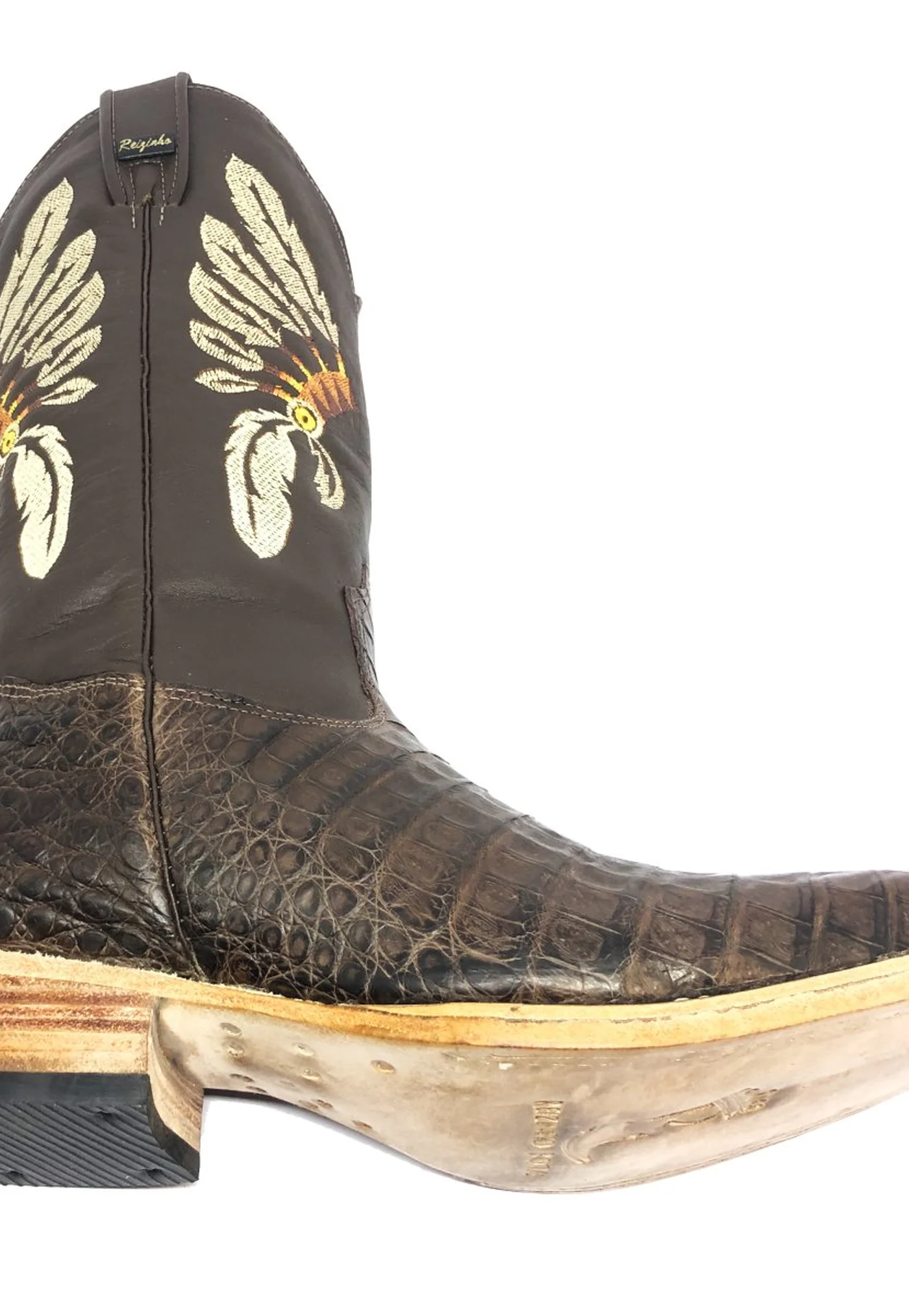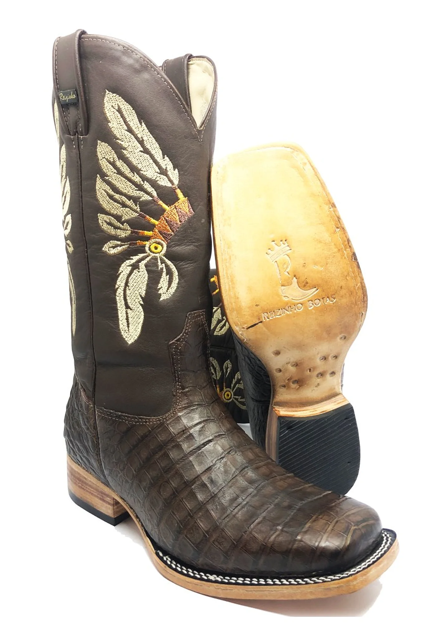 Bota Texana de Couro de Jacaré Marrom | Cano Alto Café | Bordado "Índio" | Reizinho Botas
