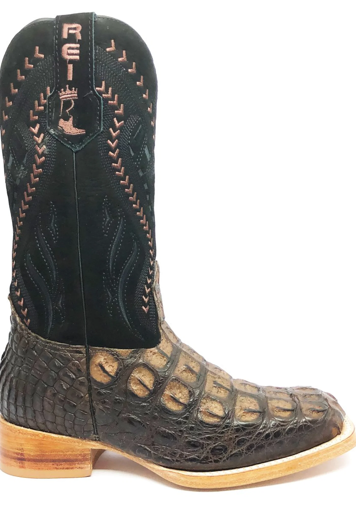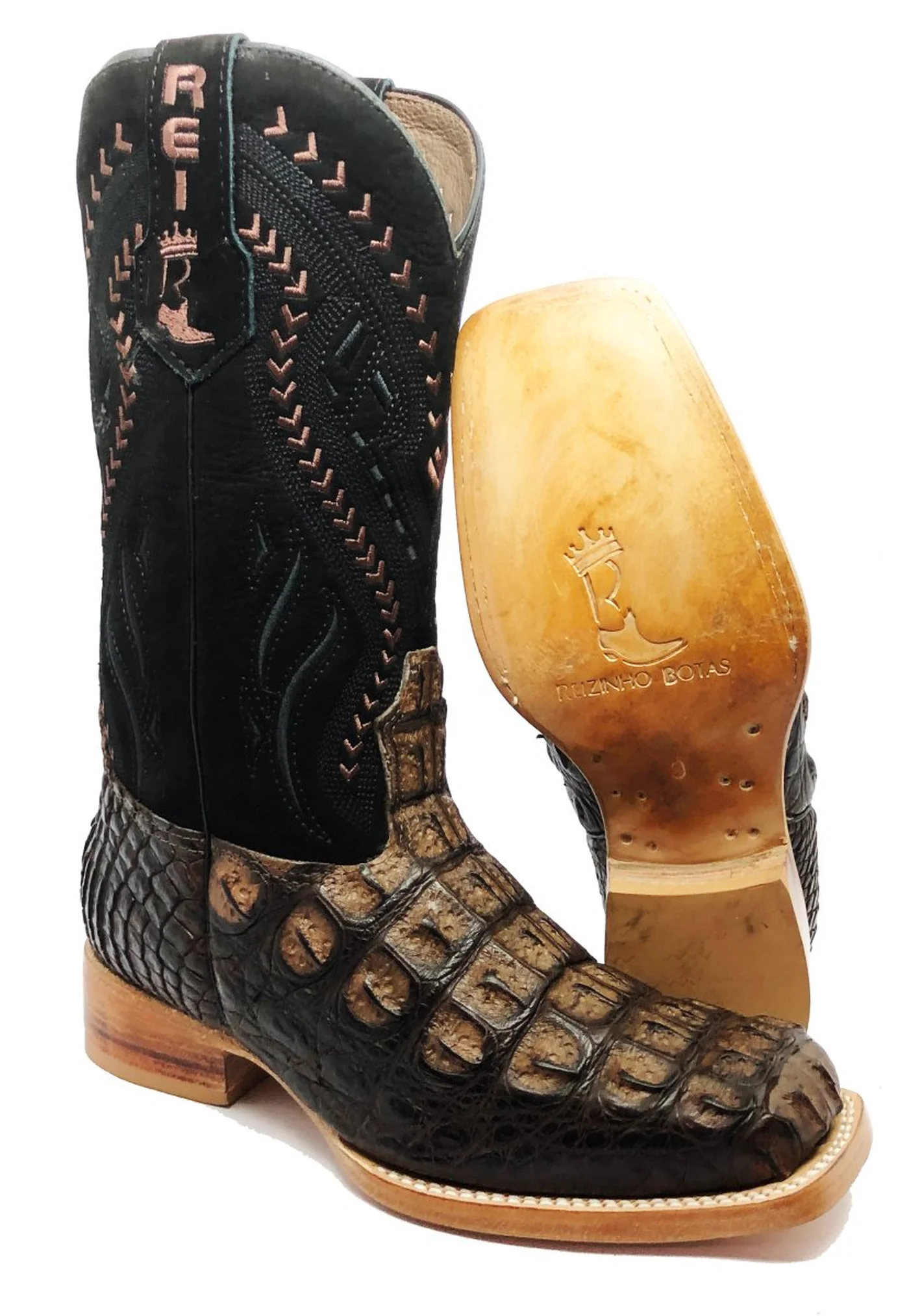 BOTA REIZINHO PREMIUM DE COURO DE JACARÉ MARROM LIMITED EDITION - CANO ALTO, BICO QUADRADO, SOLADO DE COURO ARTESANAL