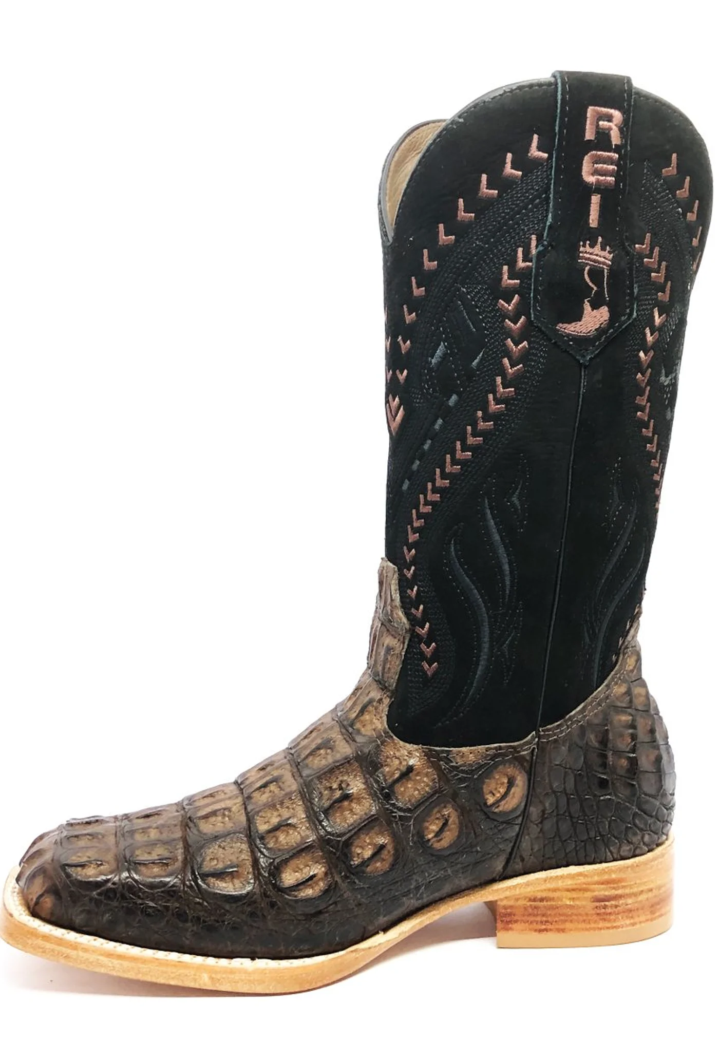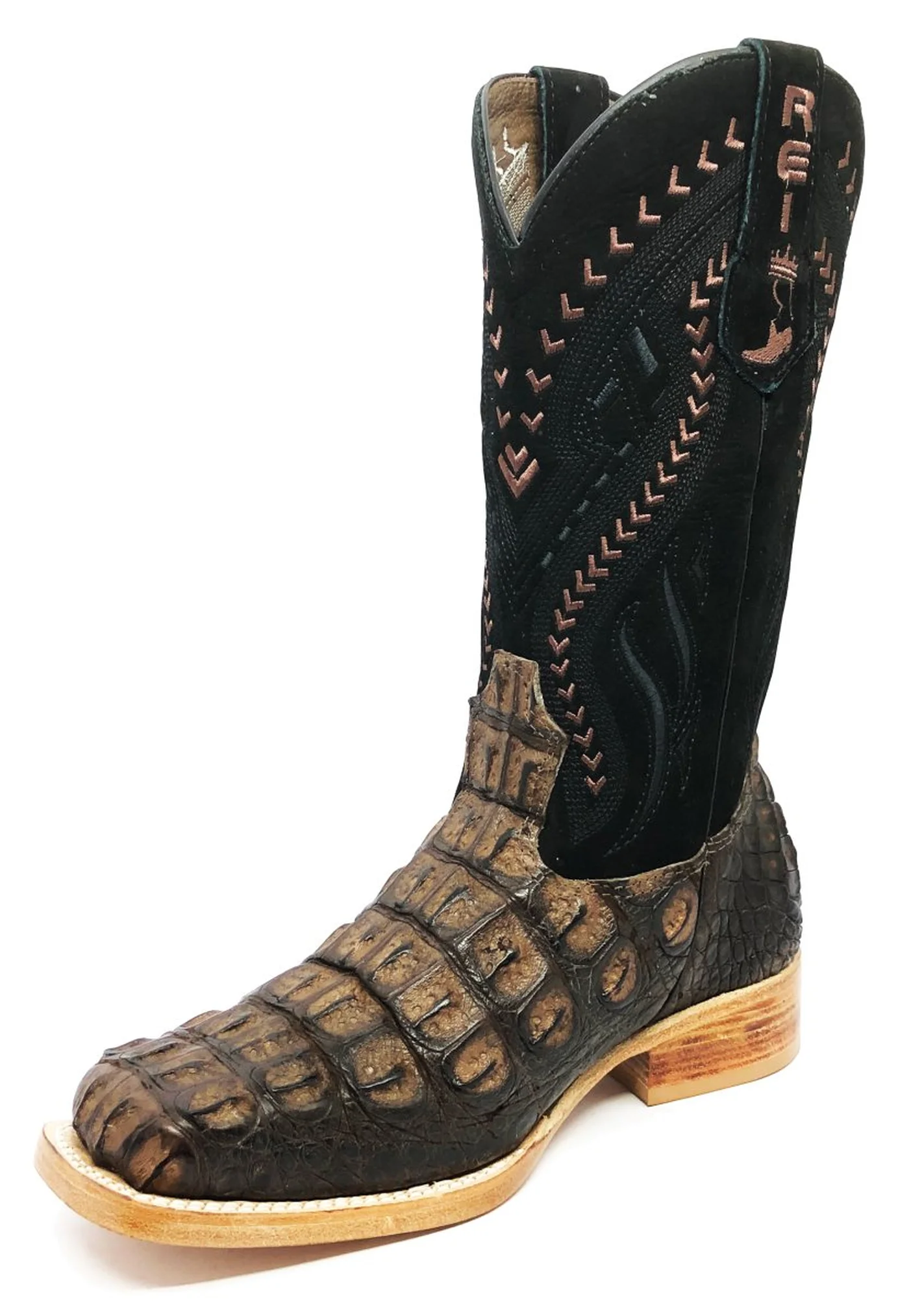 O cano da bota, com altura de 27 cm, é confeccionado em couro bovino bufalado preto de altíssima qualidade. Este material é reconhecido por sua resistência e textura única, que se assemelha à camurça, proporcionando um toque macio e agradável. O acabamento fosco do couro bufalado preto confere uma elegância discreta, enquanto o bordado "RZ027" em preto adiciona um detalhe sutil que se destaca harmoniosamente contra o fundo escuro do cano. Os detalhes em marrom do bordado criam uma conexão visual com o couro de jacaré do pé da bota, resultando em uma composição equilibrada e esteticamente agradável.