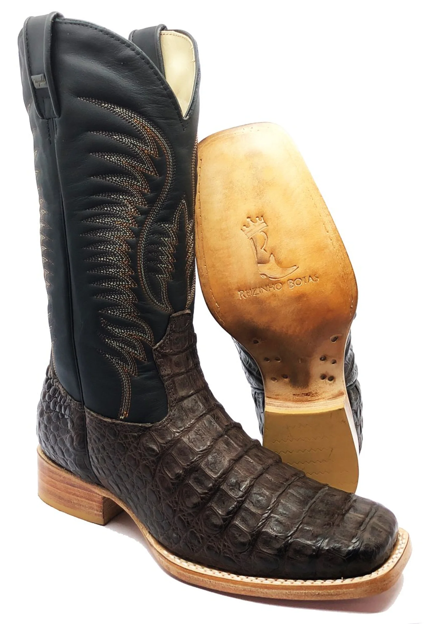 BOTA REIZINHO PREMIUM DE COURO DE JACARÉ MARROM LIMITED EDITION - CANO ALTO, BICO QUADRADO, SOLADO DE COURO ARTESANAL