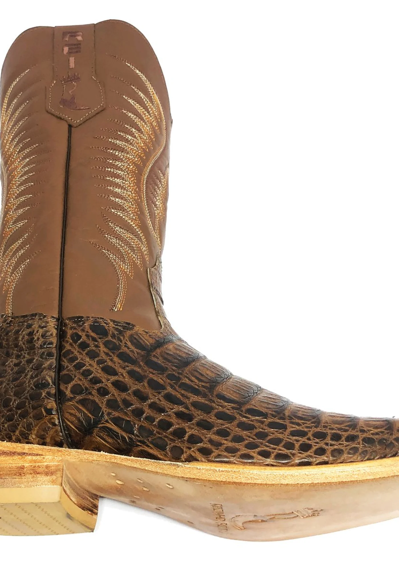 O cano da bota, com altura de 27 cm, é elaborado em couro bovino na mesma tonalidade tabaco do jacaré, criando uma harmonia cromática impecável. O clássico bordado "padrão" adorna o cano, mesclando cores tradicionais como bege, caramelo e marrom. Este detalhamento artesanal não apenas enriquece a estética da bota, mas também reforça a identidade da marca Reizinho, reconhecida por sua excelência e tradição no mercado de calçados de luxo.