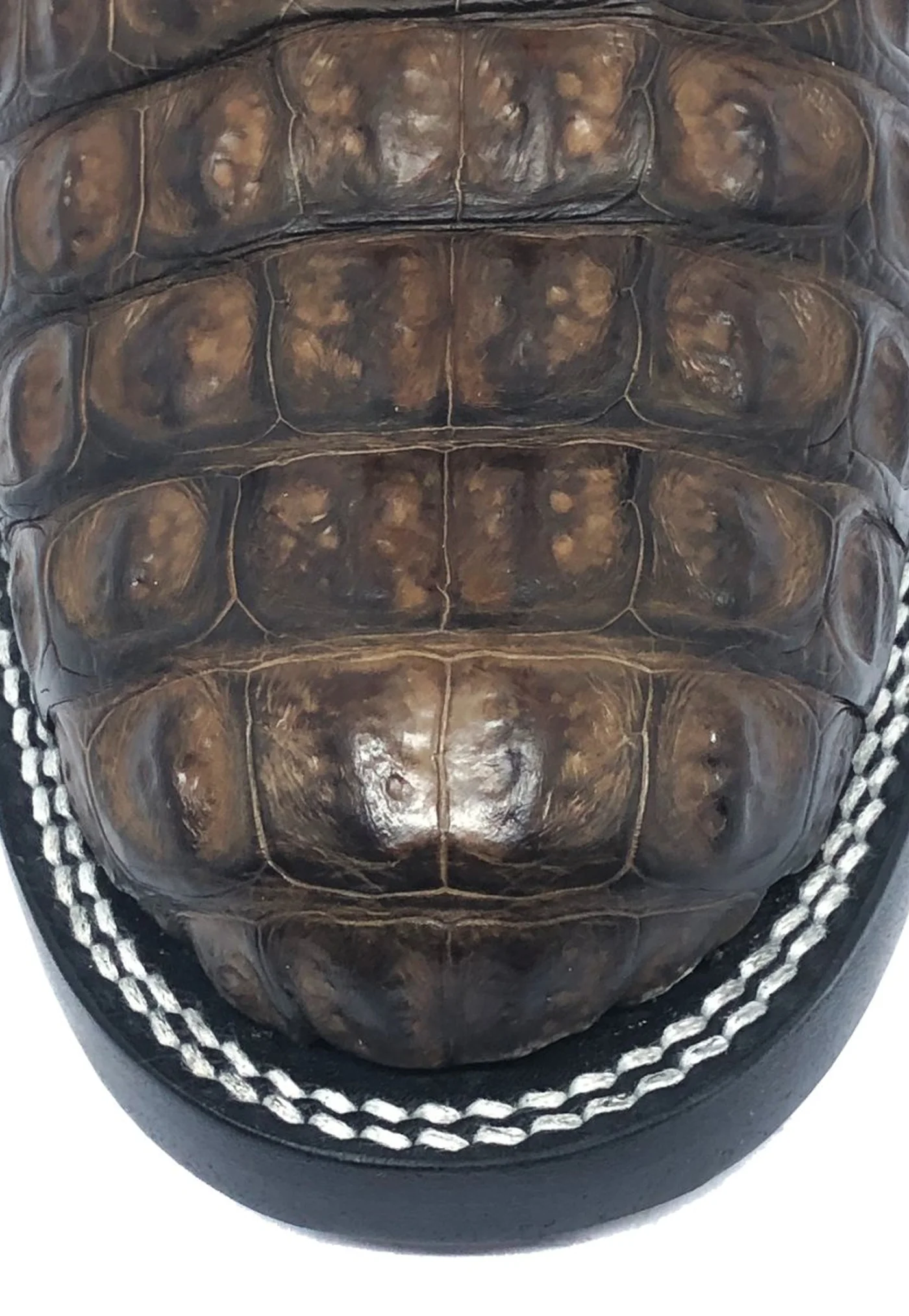 O couro de jacaré marrom, reconhecido mundialmente por sua durabilidade e aparência luxuosa, confere à bota uma textura única e imponente. Cada escama do jacaré é meticulosamente trabalhada naturalmente, criando um padrão imponentemente texturizado, refletindo a exclusividade e o prestígio que este material proporciona.