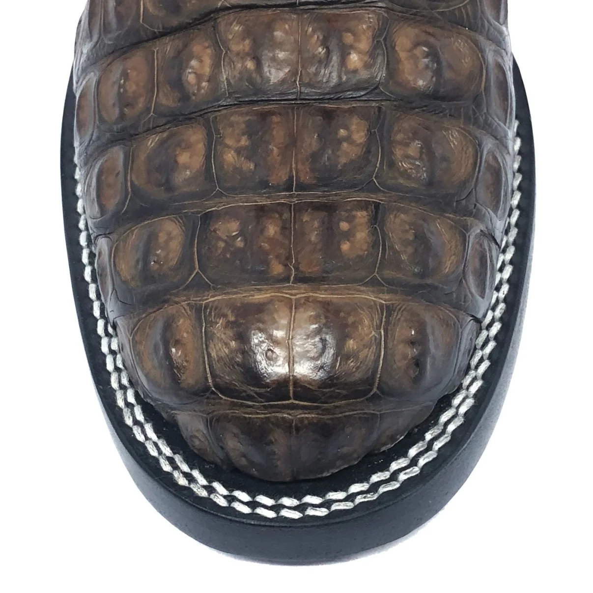 O cano, confeccionado em couro bovino de alta qualidade, possui 27 cm de altura e apresenta um tom marrom café que contrasta perfeitamente com o couro de jacaré. Essa combinação de cores realça a profundidade e a riqueza do design, criando uma harmonia visual que é ao mesmo tempo sofisticada e atraente.
