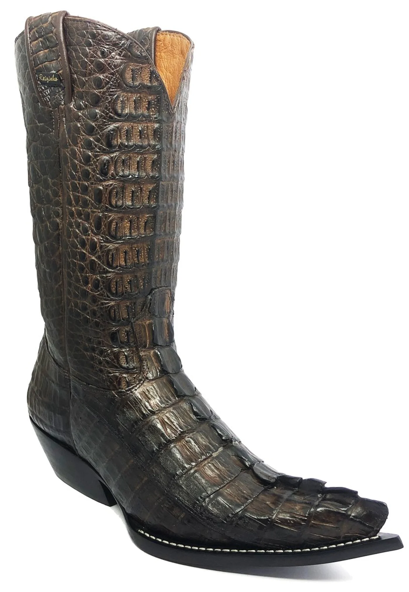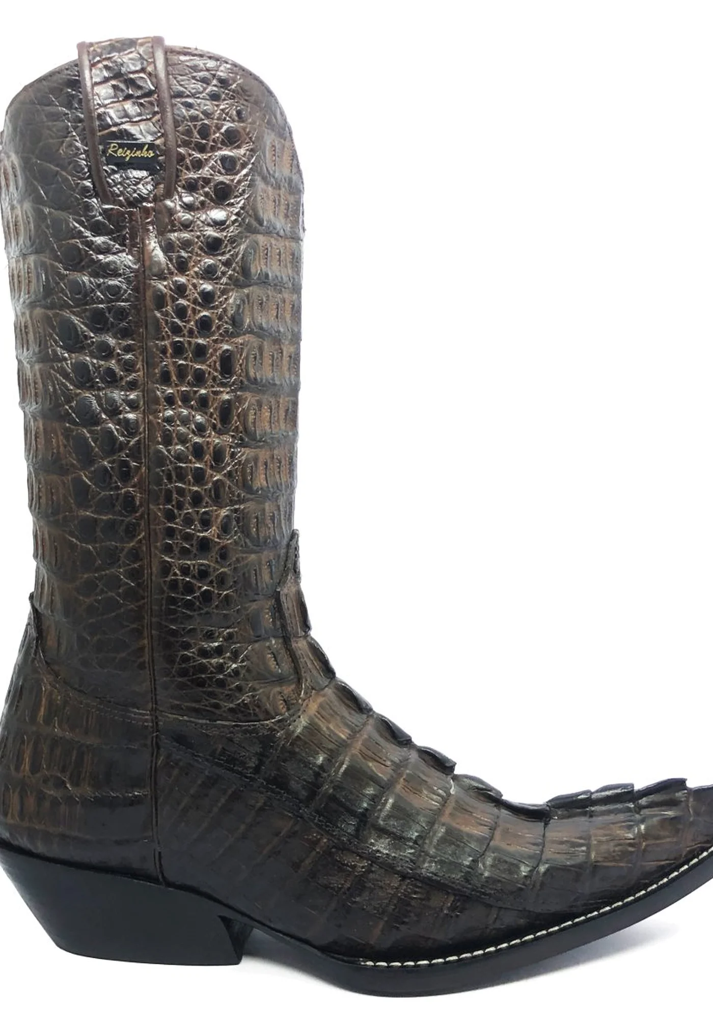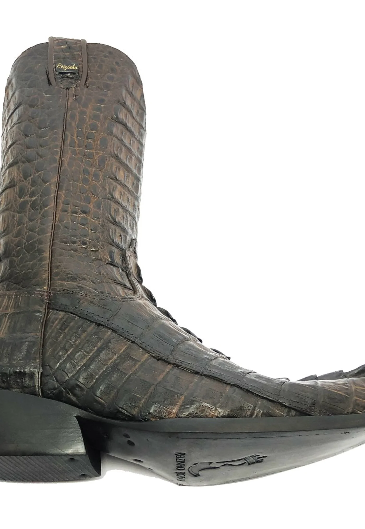BOTA REIZINHO PREMIUM DE COURO DE JACARÉ MARROM RABO LIMITED EDITION - CANO ALTO, BICO FINO, SOLADO DE COURO ARTESANAL