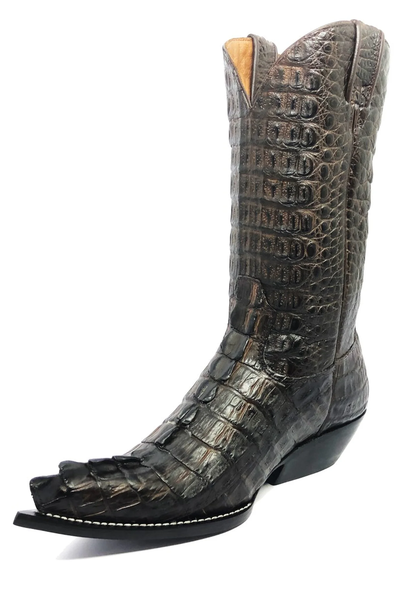 Em um universo onde o luxo é medido pelos detalhes, esta bota se destaca não só pela raridade do material, mas pela forma como o couro de jacaré é trabalhado. Ao contrário dos modelos tradicionais, que apresentam o cano em couro bovino e couro exótico apenas nos pés, aqui ele domina a peça de ponta a ponta, conferindo-lhe uma imponência inquestionável. As escamas do couro, com sua textura natural e refinada, são o que tornam este exemplar um verdadeiro tesouro, exaltando a beleza única e a elegância atemporal que somente o couro de jacaré pode oferecer. Mas o que realmente transforma este modelo em algo extraordinário é a serrilha presente no rabo do jacaré, com a sua crista visivelmente posicionada no centro do pé. Este detalhe exclusivo não só evidencia a autenticidade do material, como eleva o design da bota a um nível de sofisticação raramente visto.