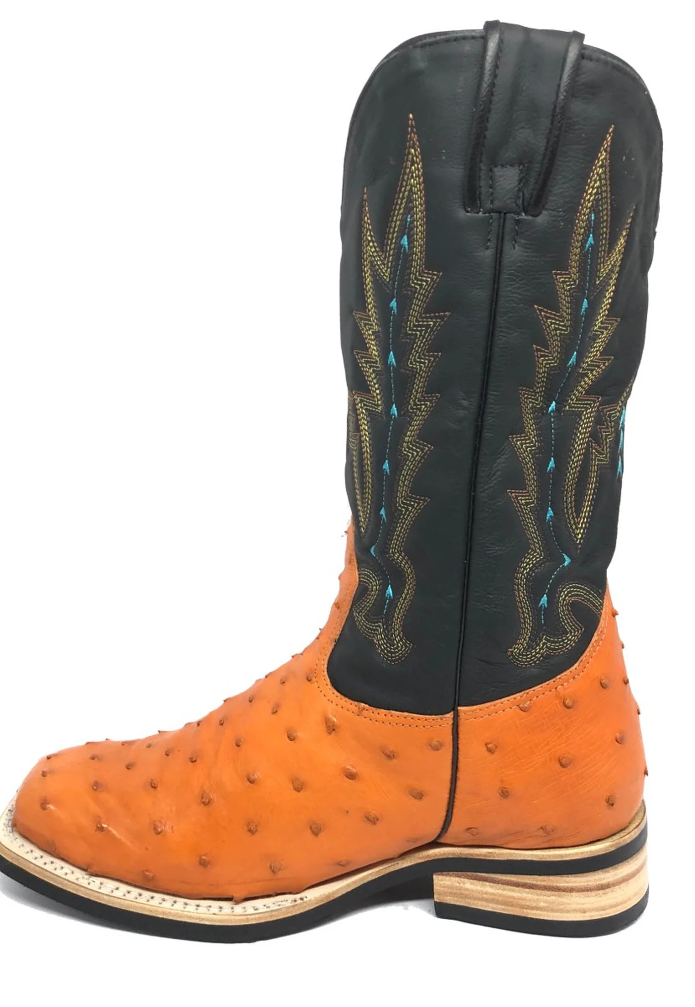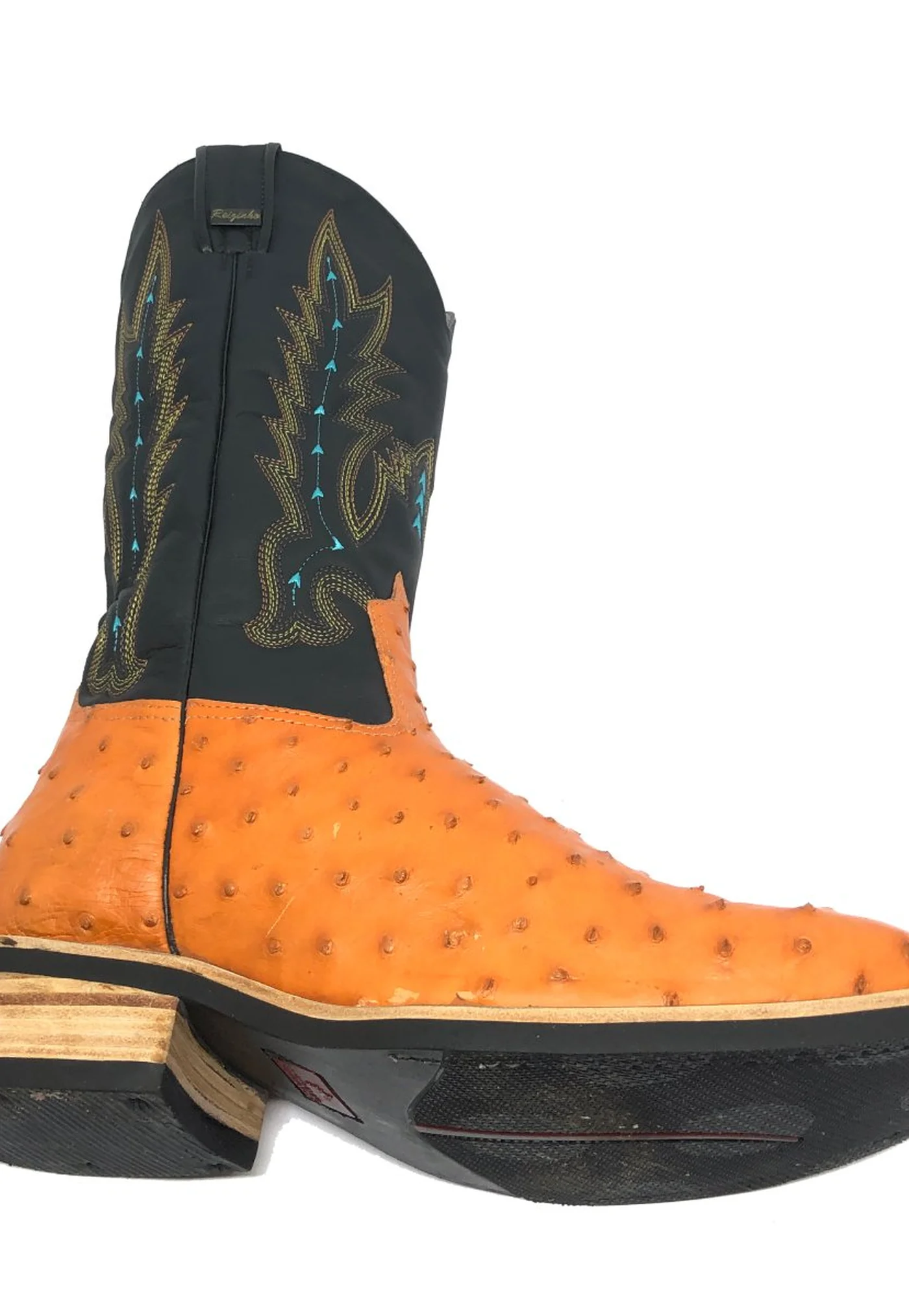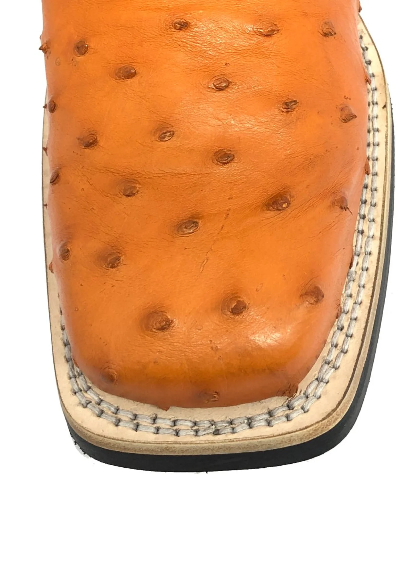 Bota de Couro de Avestruz Cheio Laranja - Cano Alto, Bico Quadrado, SOLADO X-FLEX ARTESANAL