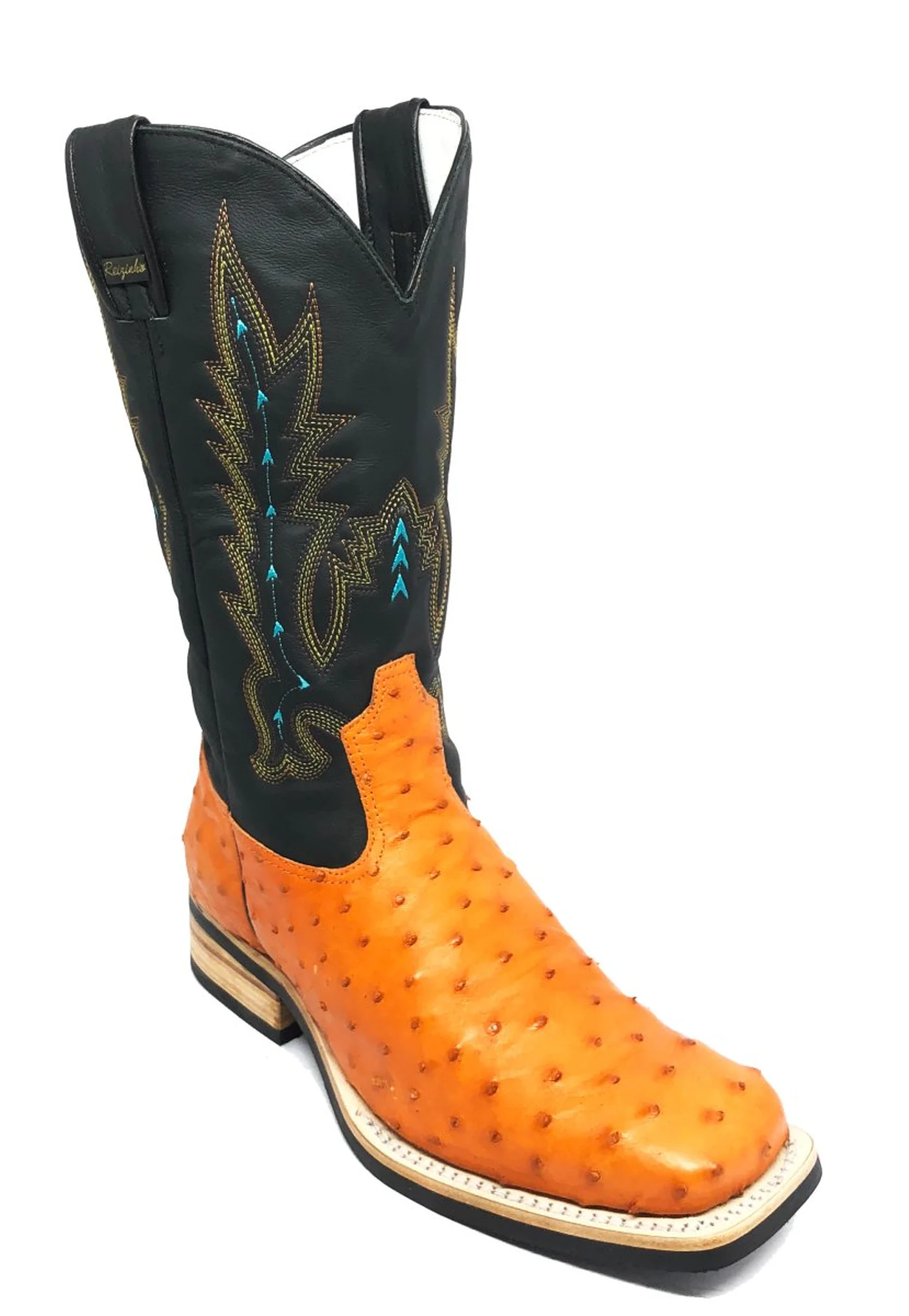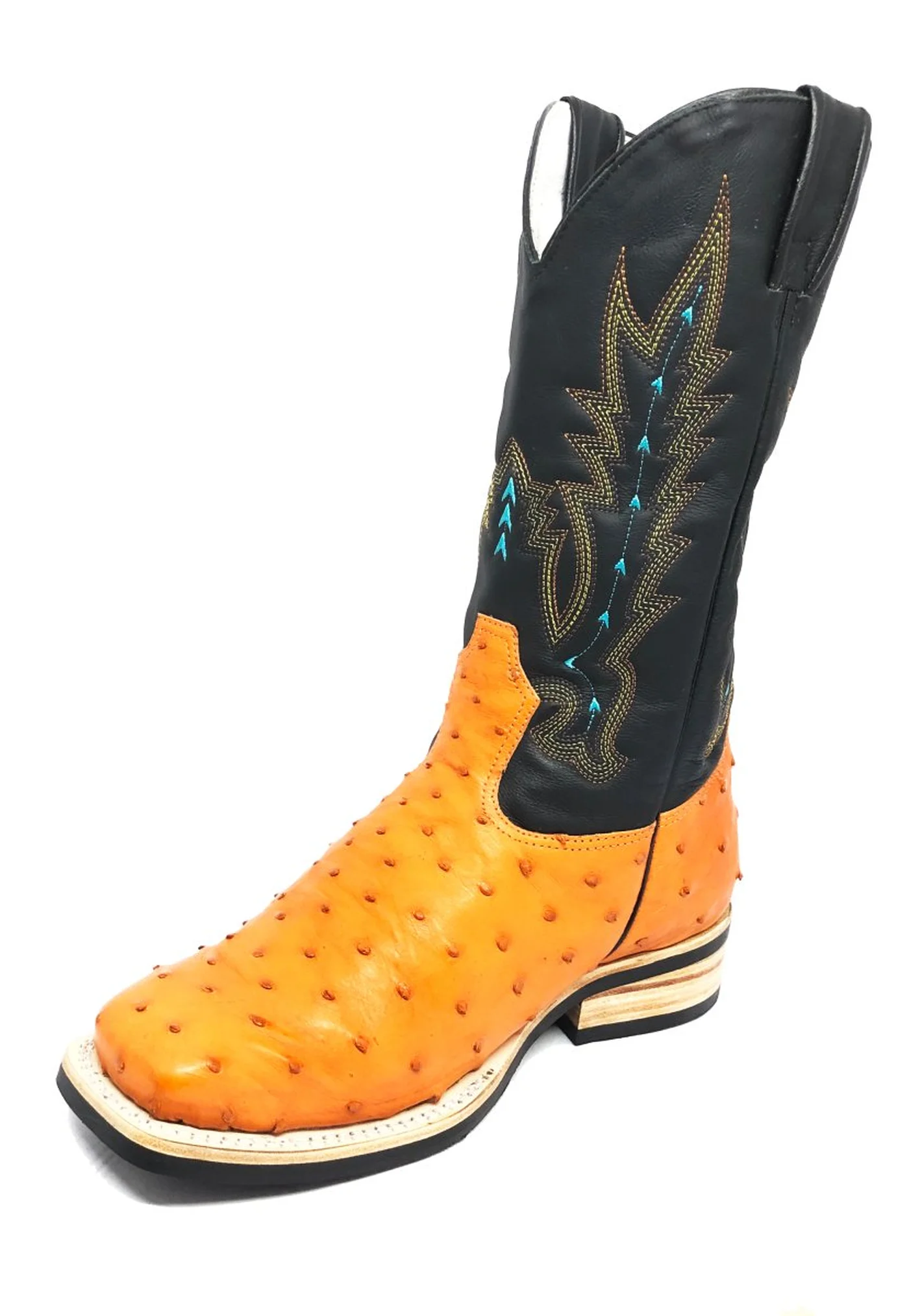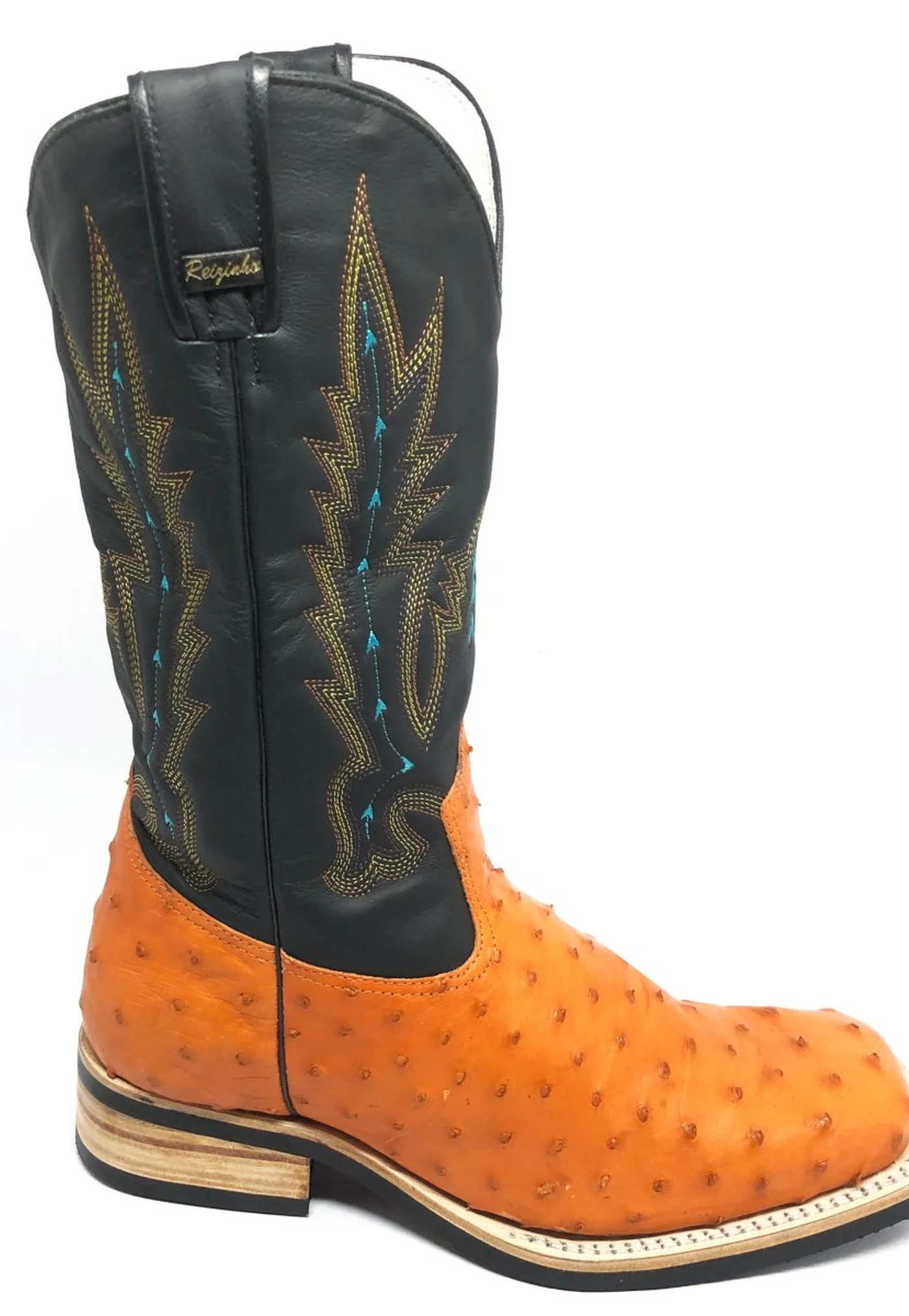 Bota de Couro de Avestruz Cheio Laranja - Cano Alto, Bico Quadrado, SOLADO X-FLEX ARTESANAL