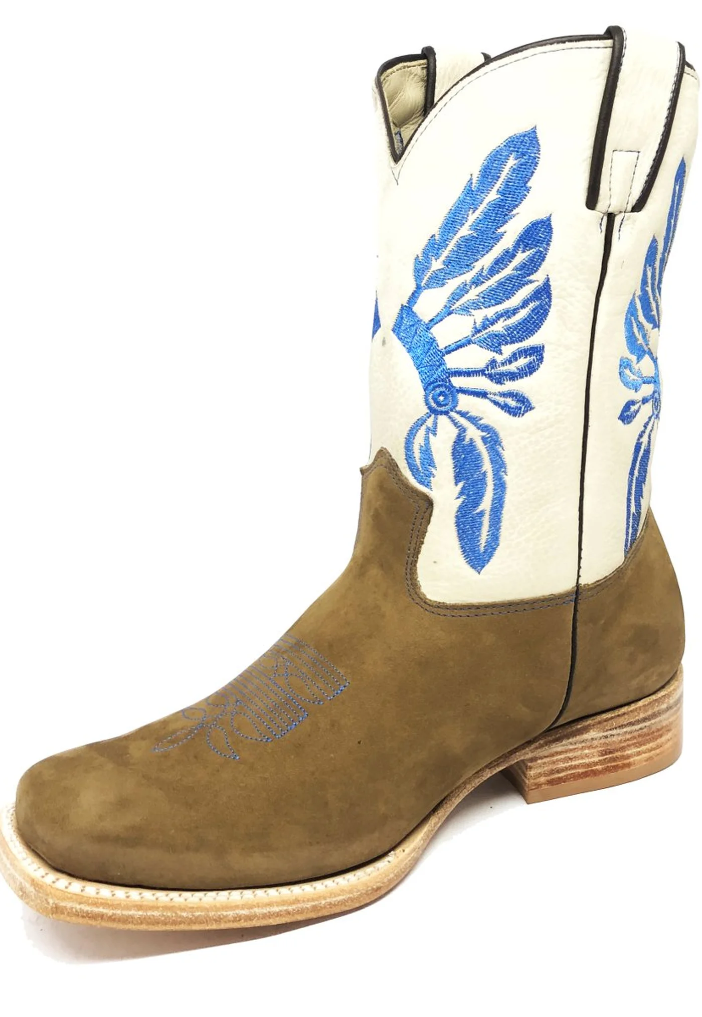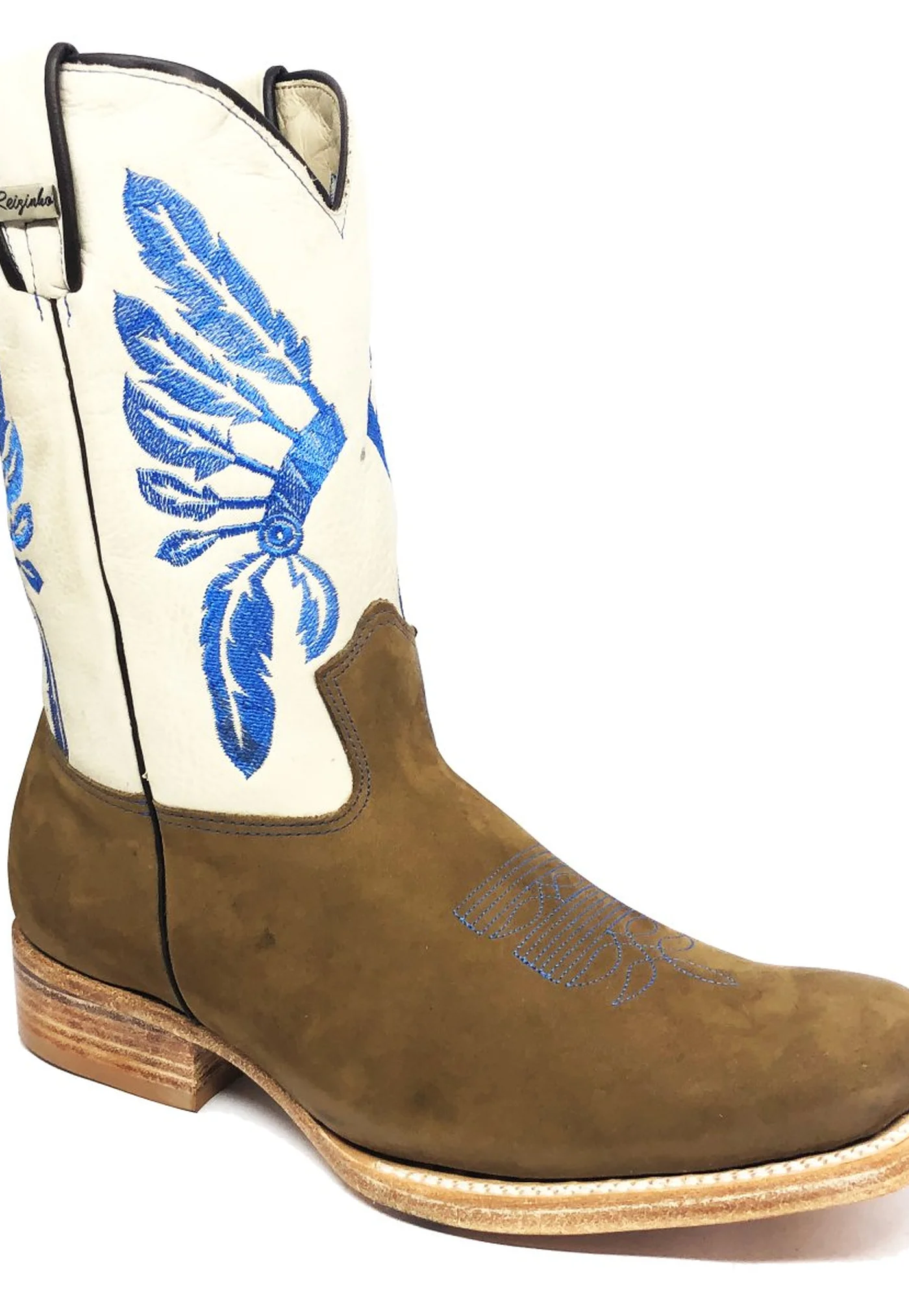 COM CANO DE 21 CM NA COR BEGE, ELA EXIBE O BORDADO "ÍNDIO" NA TONALIDADE AZUL, UM DETALHE IMPONENTE QUE CAPTURA O ESPÍRITO DE AVENTURA E LIBERDADE, TEMAS CENTRAIS NO UNIVERSO WESTERN. COMPLEMENTANDO ESSE VISUAL, UM FLORÃO NO PEITO DO PÉ, TAMBÉM EM AZUL, ADICIONA UM TOQUE REFINADO E EXCLUSIVO, HARMONIZANDO COM OS BORDADOS E DESTACANDO-SE NO COURO BUFALADO DE MARFIM.