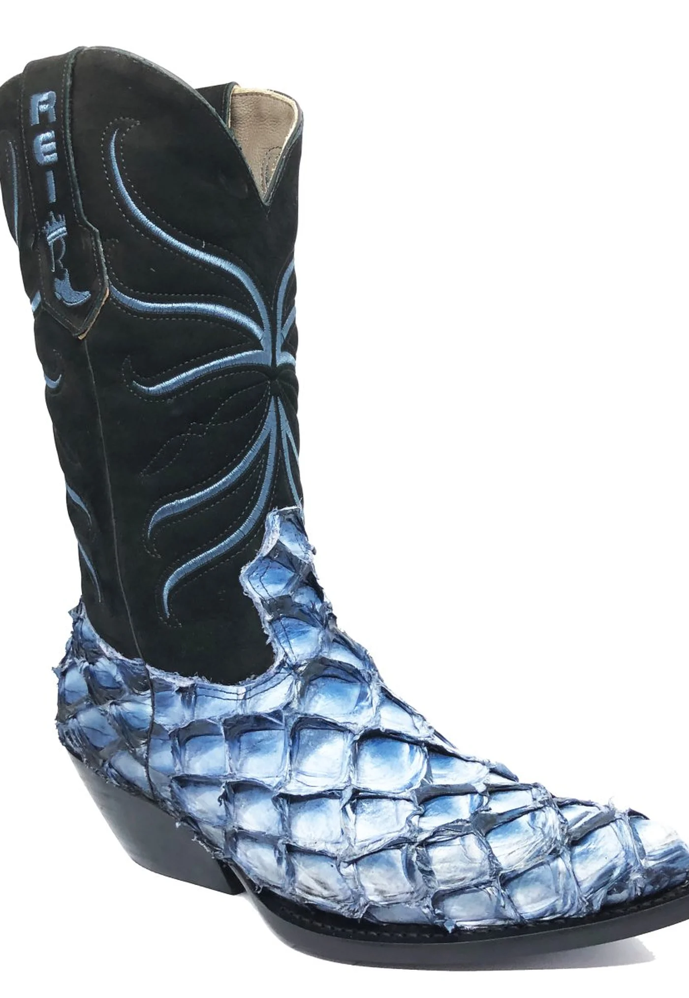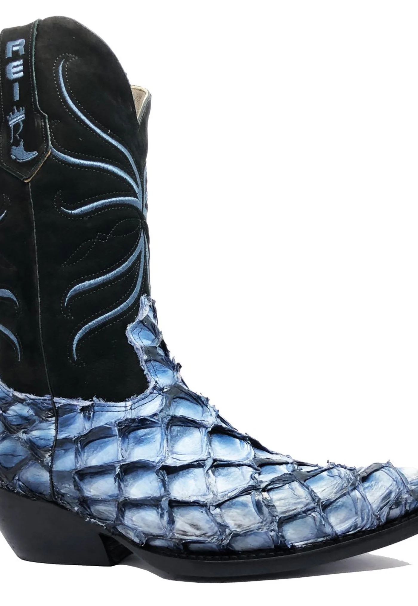 Bota Reizinho Premium Couro De Pirarucu Light Blue Limited Edition - Cano Alto, Bico Quadrado, Solado De Couro Artesanal