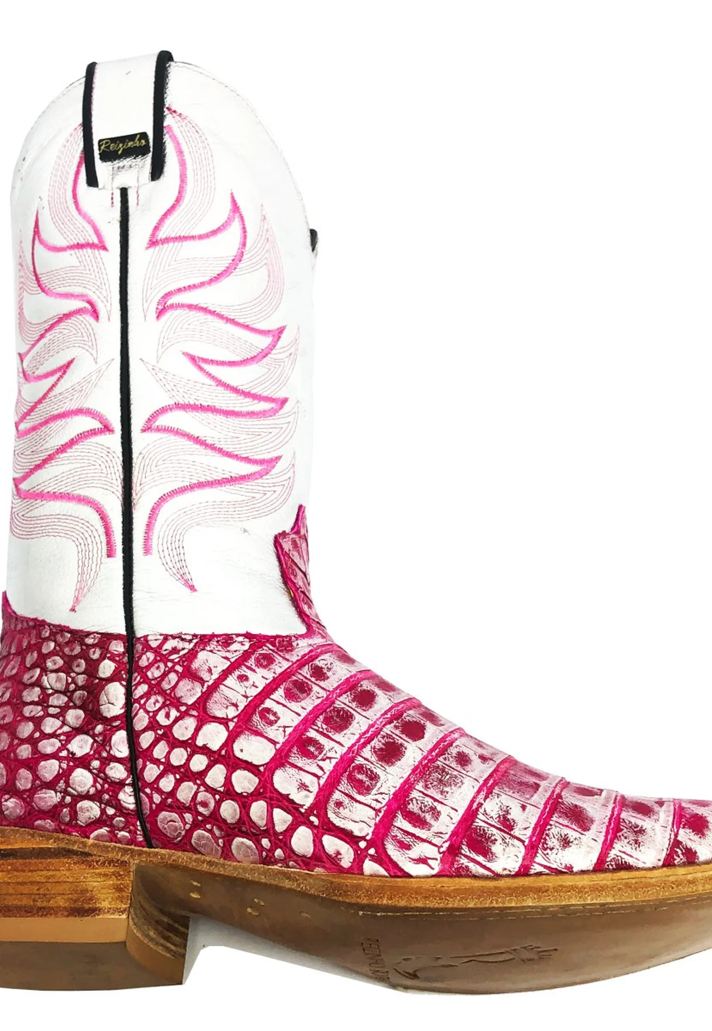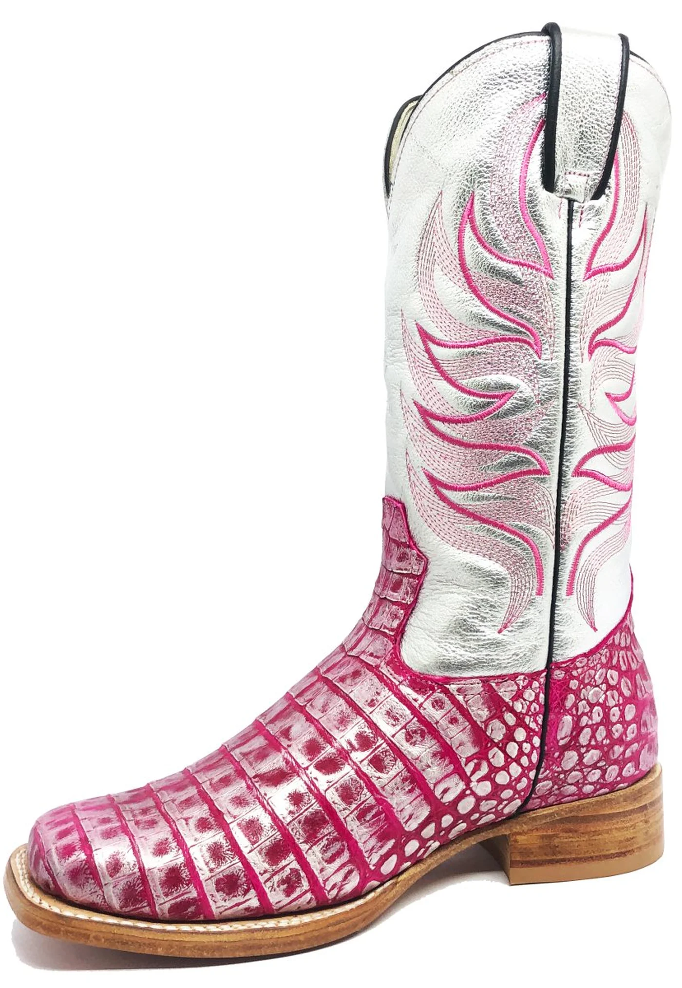 BOTA REIZINHO PREMIUM DE COURO DE JACARÉ SILVER PINK (ROSA E PRATA) LIMITED EDITION - CANO ALTO, BICO QUADRADO, SOLADO DE COURO ARTESANAL
