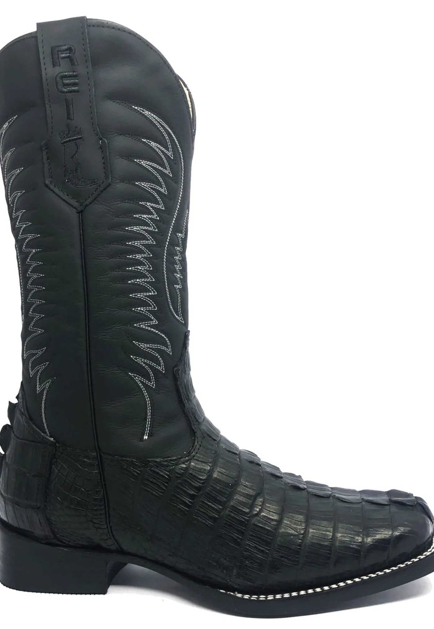 O cano de 27 cm é feito em couro bovino de exportação, conhecido por sua durabilidade e acabamento superior. Forrada em couro bovino, a bota oferece conforto e resistência excepcionais. O bordado Padrão em preto e branco, complementado pelos puxadores REI PREMIUM bordados em preto, adiciona um toque de elegância clássica, destacando-se de maneira sofisticada contra o fundo preto do cano.