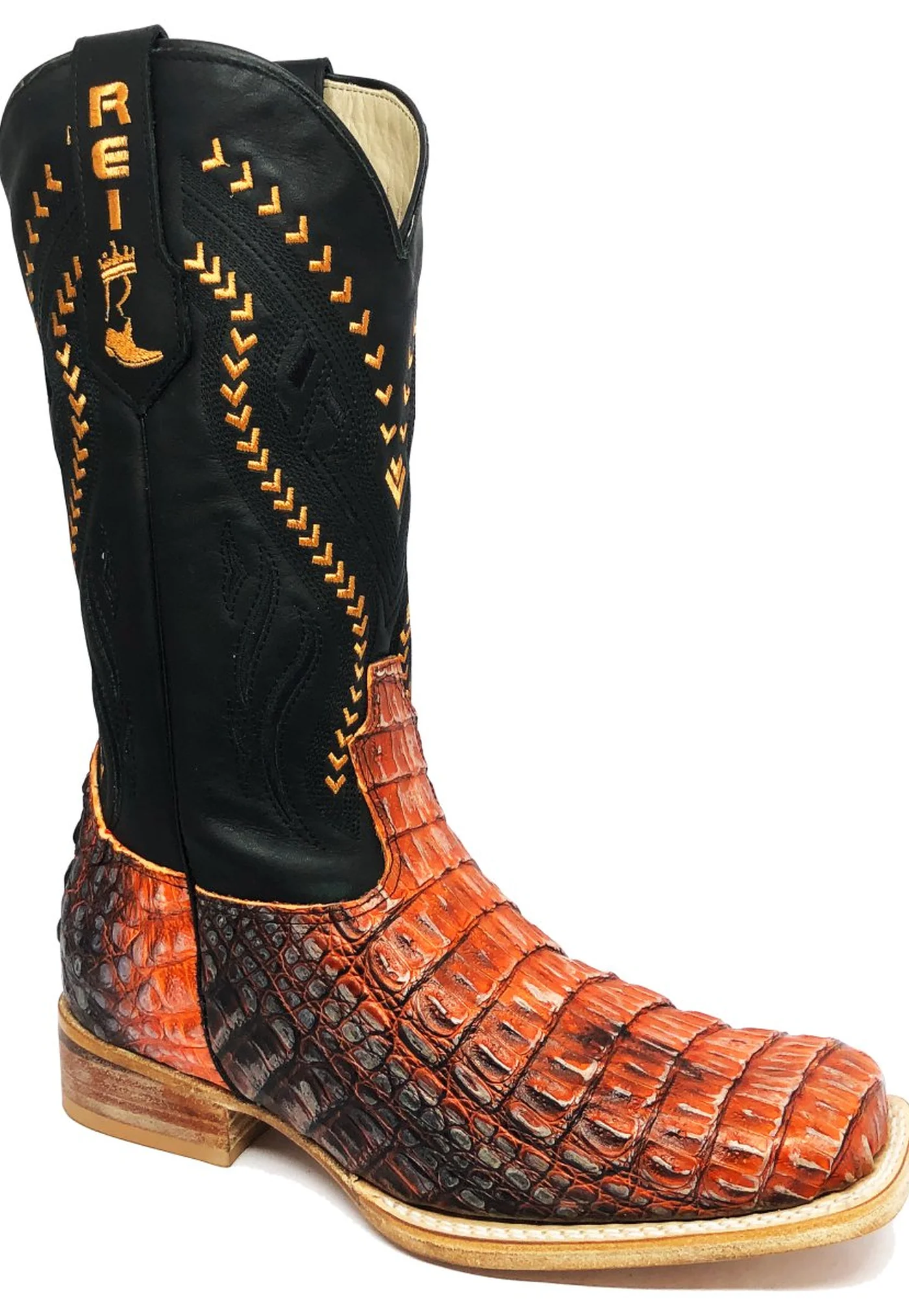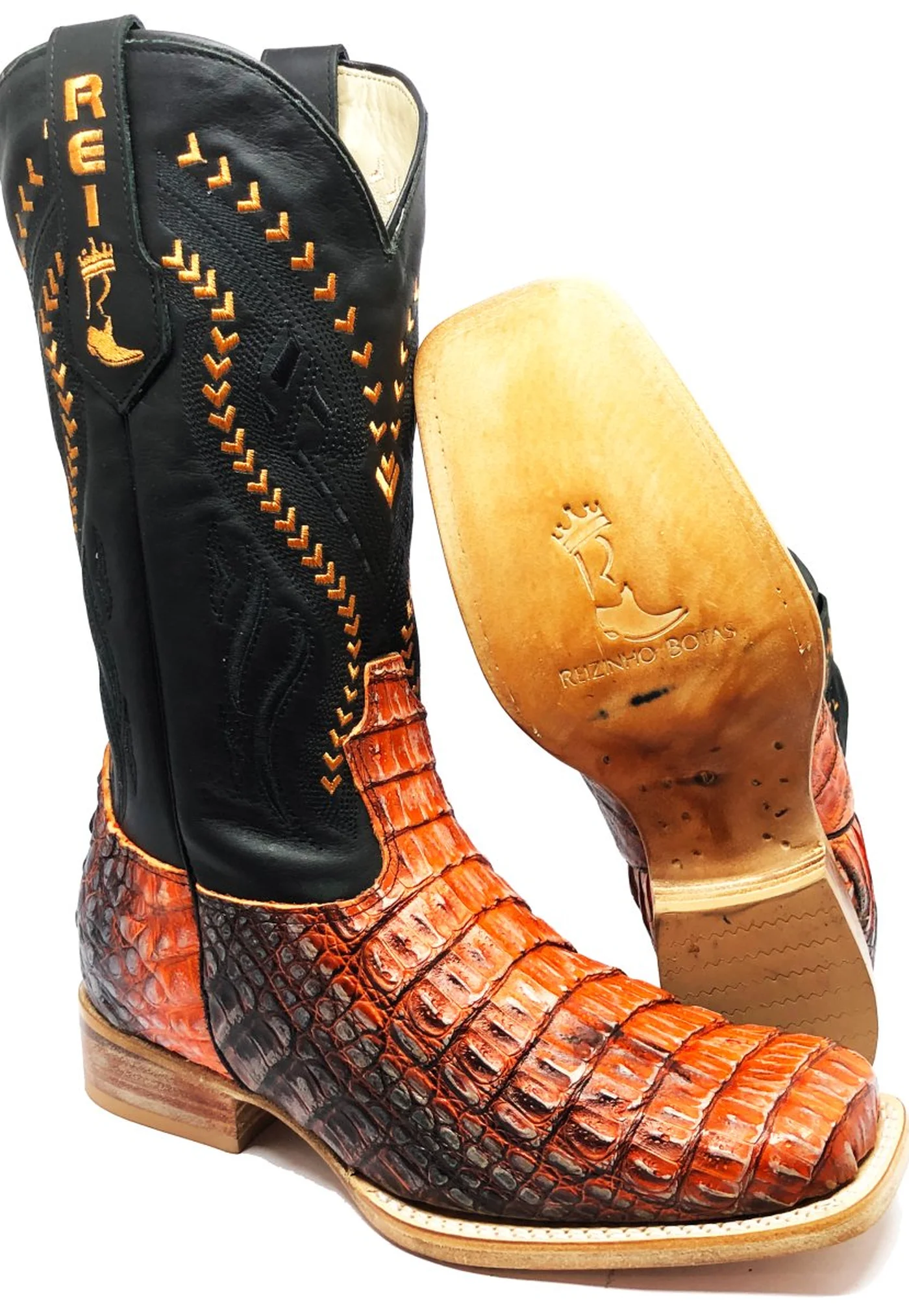 BOTA REIZINHO PREMIUM DE COURO DE JACARÉ DARKNESS ORANGE LIMITED EDITION - CANO ALTO, BICO QUADRADO, SOLADO DE COURO ARTESANAL