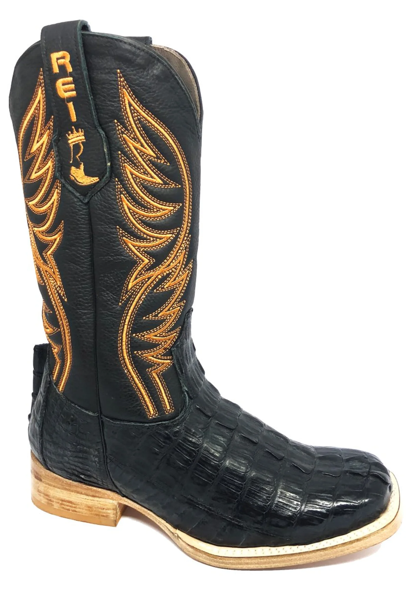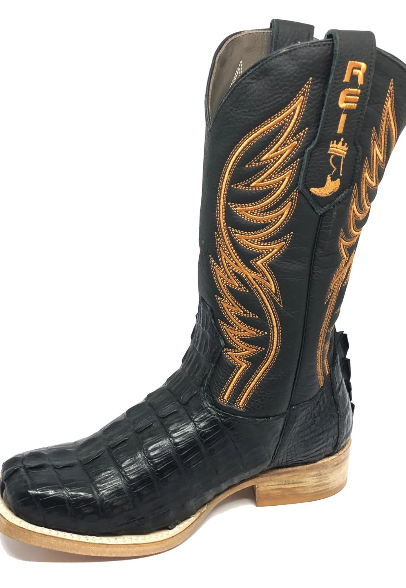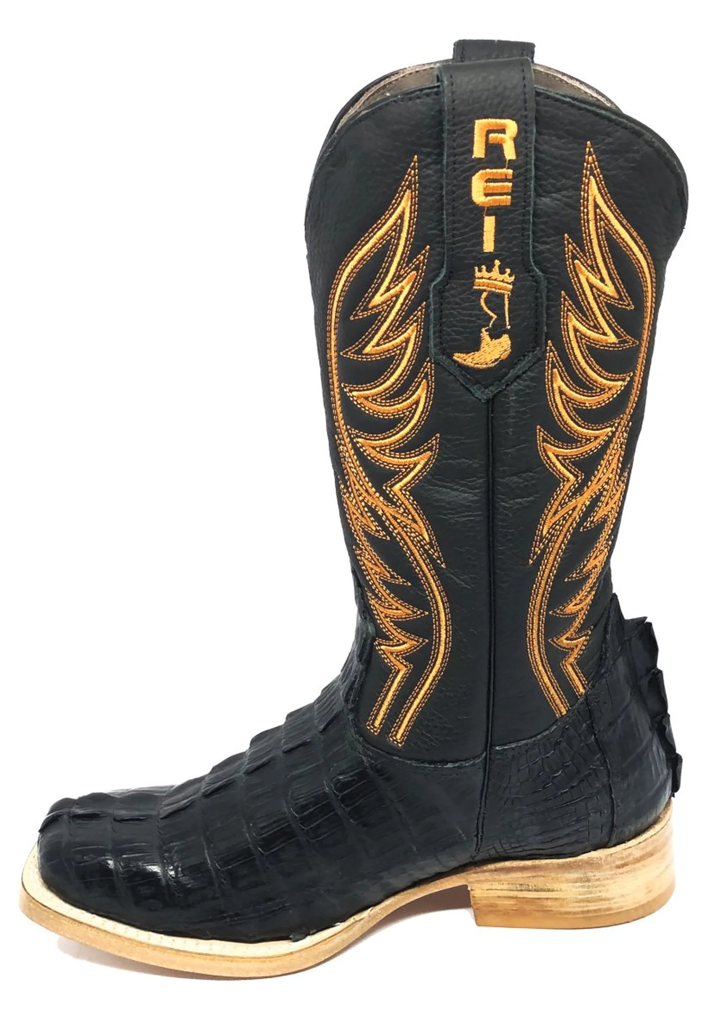 BOTA REIZINHO PREMIUM DE COURO DE JACARÉ PRETO RABO LIMITED EDITION - CANO ALTO, BICO QUADRADO, SOLADO DE COURO ARTESANAL INJETADO
