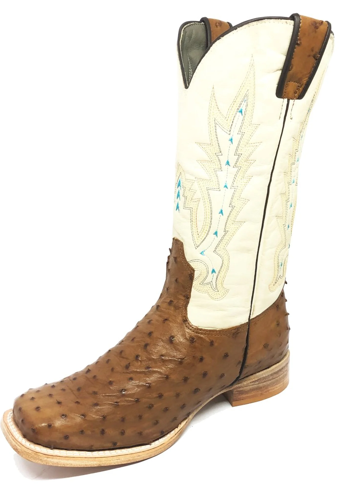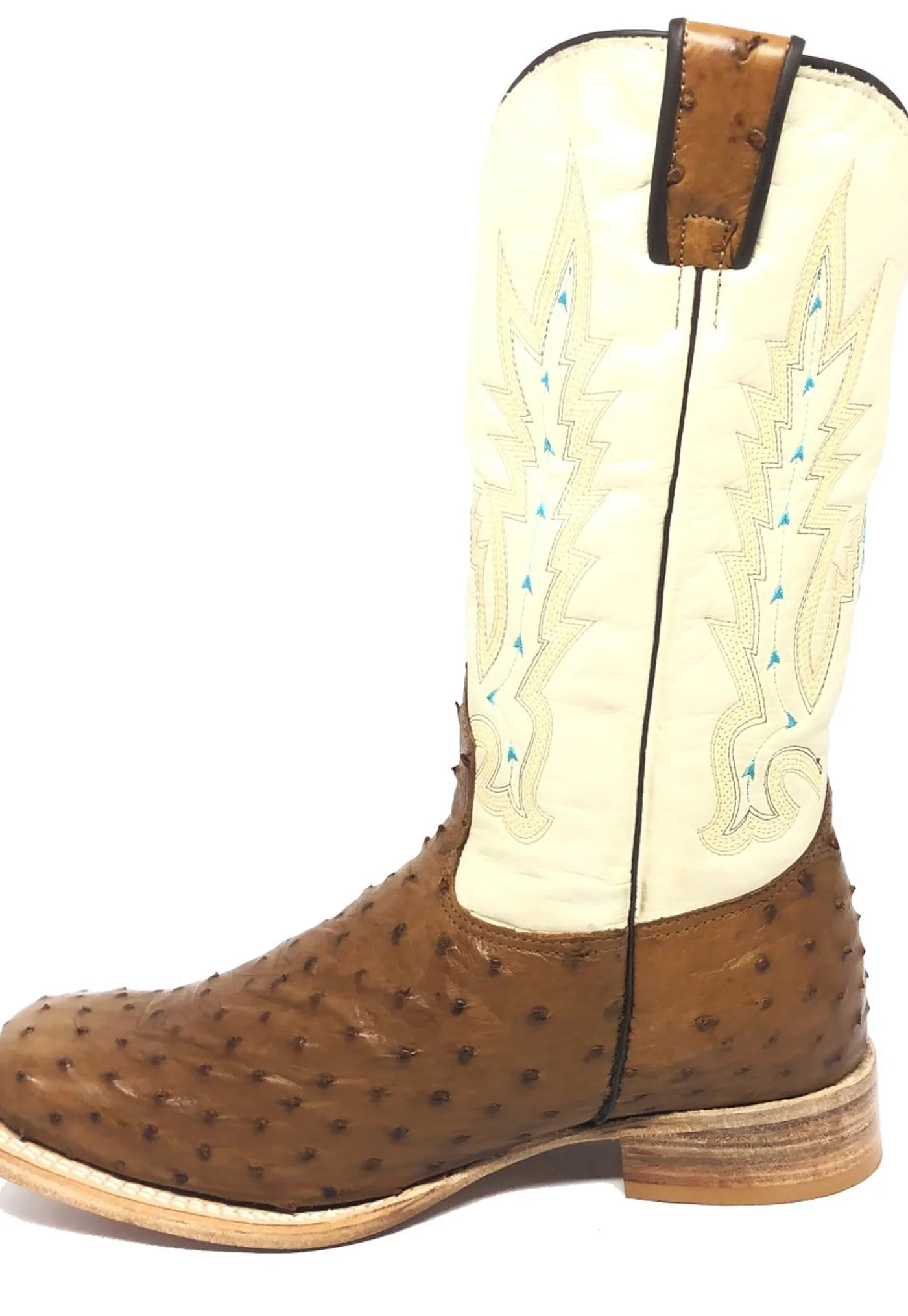 O cano de 27cm, em couro bovino na cor bege, harmoniza perfeitamente com o clássico bordado "AZUL", cujos detalhes em azul contrastam elegantemente com o tom conhaque do avestruz. Os puxadores, feitos do mesmo couro de avestruz, são um toque de requinte adicional, combinando perfeitamente com o resto da bota.