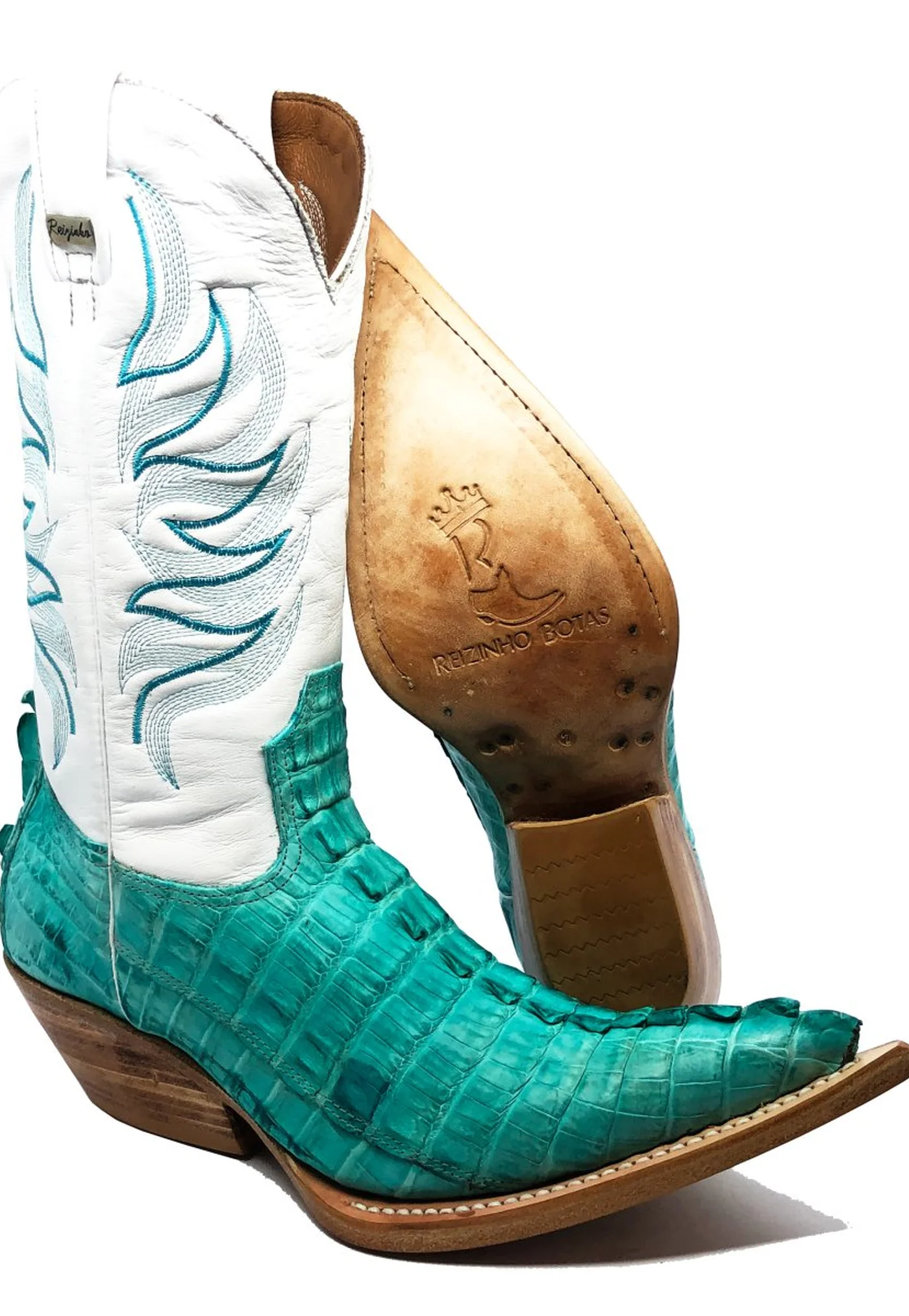 BOTA REIZINHO PREMIUM DE COURO DE JACARÉ AZUL OCEAN RABO LIMITED EDITION - CANO ALTO, BICO FINO, SOLADO DE COURO ARTESANAL