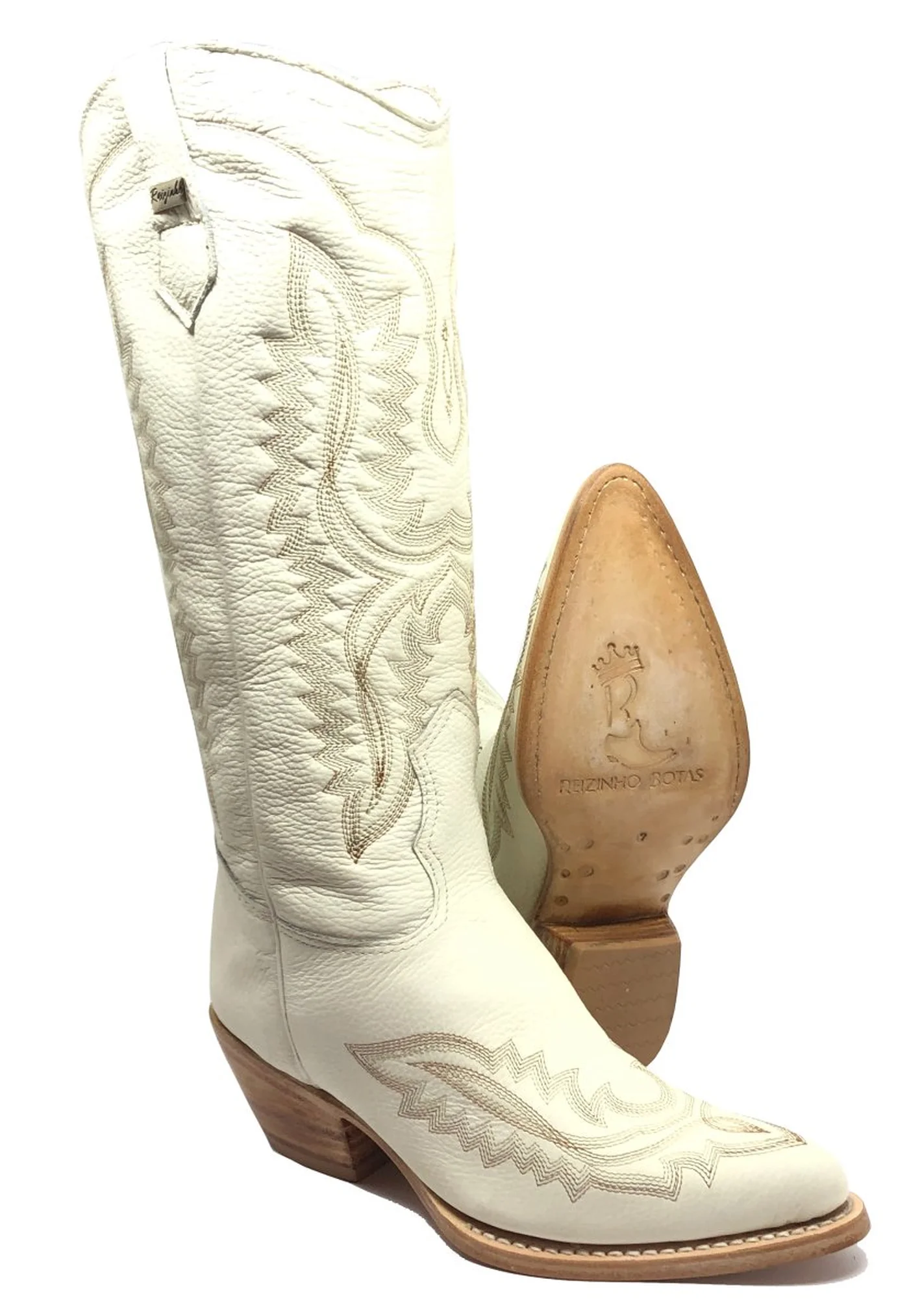 BOTA REIZINHO WESTERN PREMIUM DE COURO BOVINO OFF WHITE LIMITED EDITION - CANO ALTO, BICO FINO ARREDONDADO, SOLADO DE COURO ARTESANAL