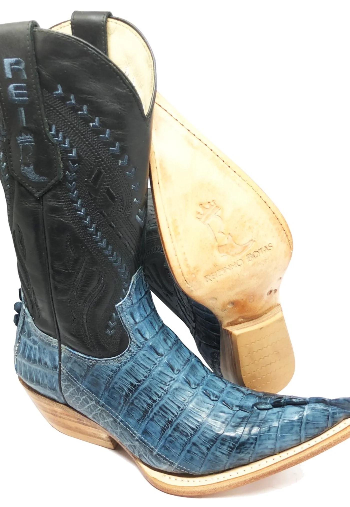 BOTA REIZINHO PREMIUM DE COURO DE JACACRÉ BLUE STONE RABO LIMITED EDITION - CANO ALTO, BICO FINO, SOLADO DE COURO ARTESANAL