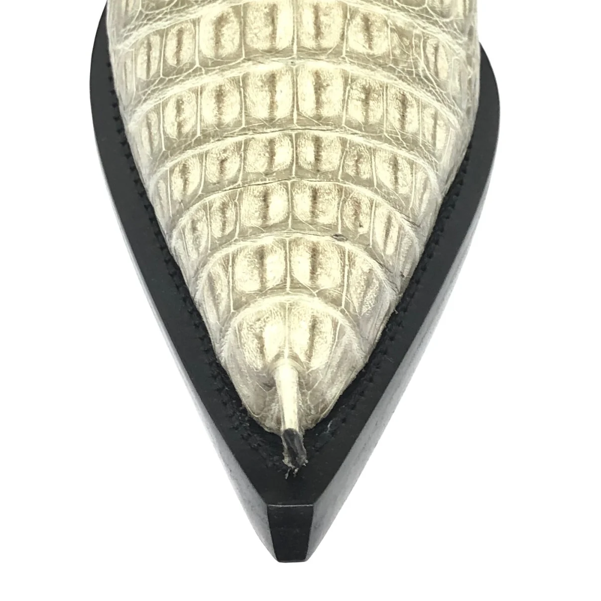 Com um bico Fininho Normal (aquele que não é muito levantado) e acabamento em Agulha, a Bota de Jacaré Ice Storm oferece um visual elegante e sofisticado. O solado de couro artesanal, com salto carrapeta, completa a bota, conferindo estabilidade e durabilidade. O processo de fabricação do solado envolve técnicas tradicionais de colagem, pregação, costura e ponteamento na frente, resultando em uma obra-prima de durabilidade e firmeza.