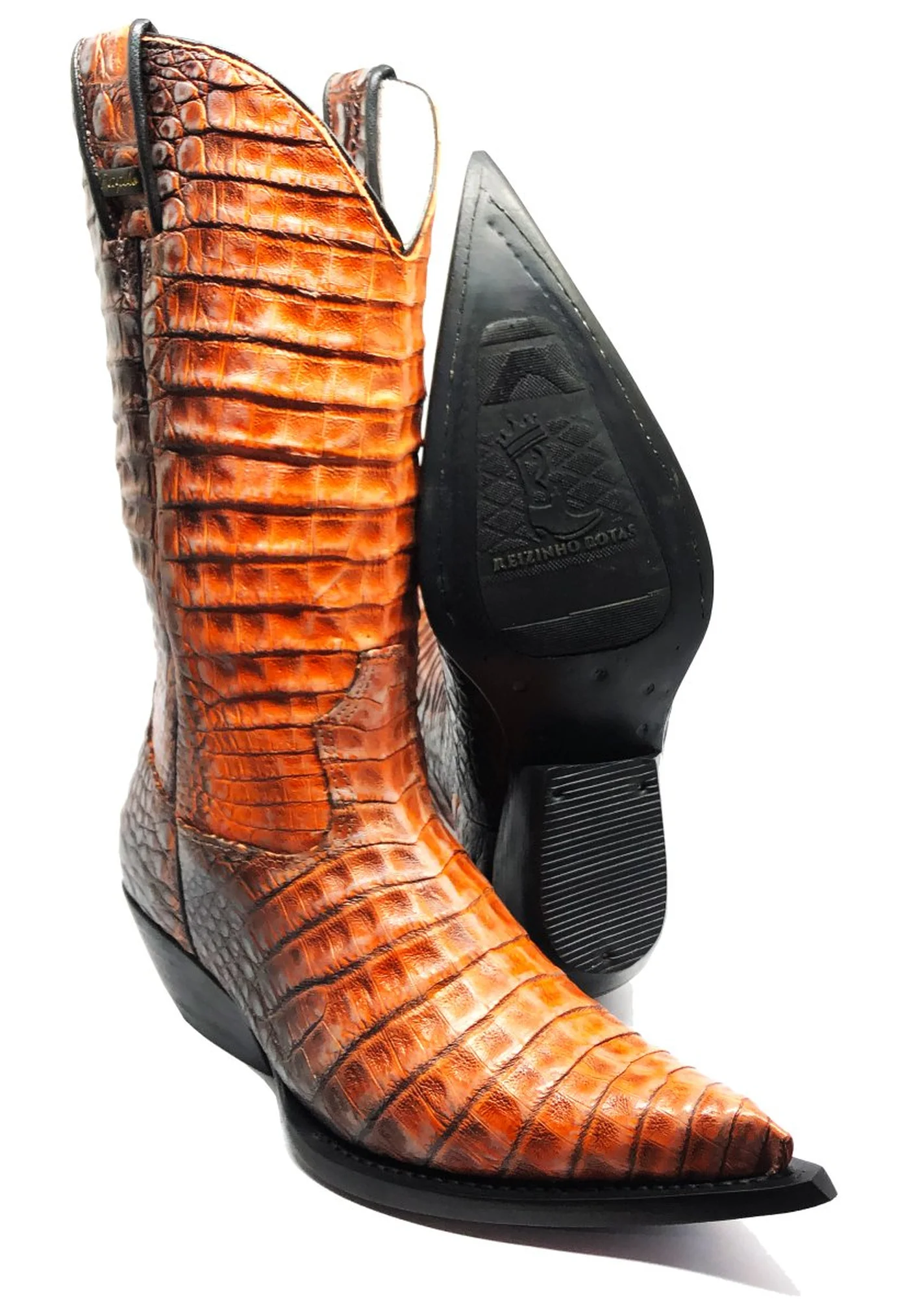 BOTA REIZINHO PREMIUM DE COURO DE JACARÉ DARKNESS ORANGE LIMITED EDITION - CANO ALTO, BICO FINO, SOLADO DE COURO ARTESANAL INJETADO