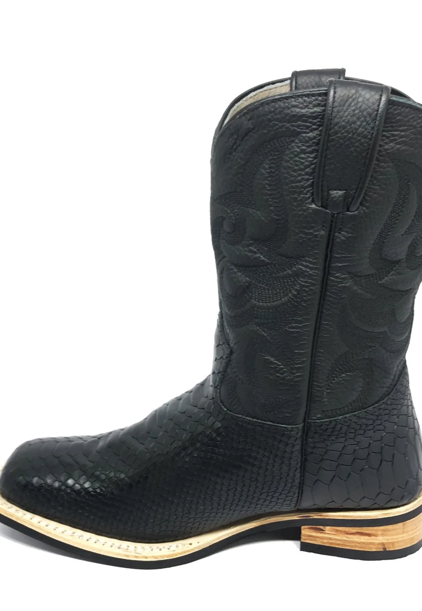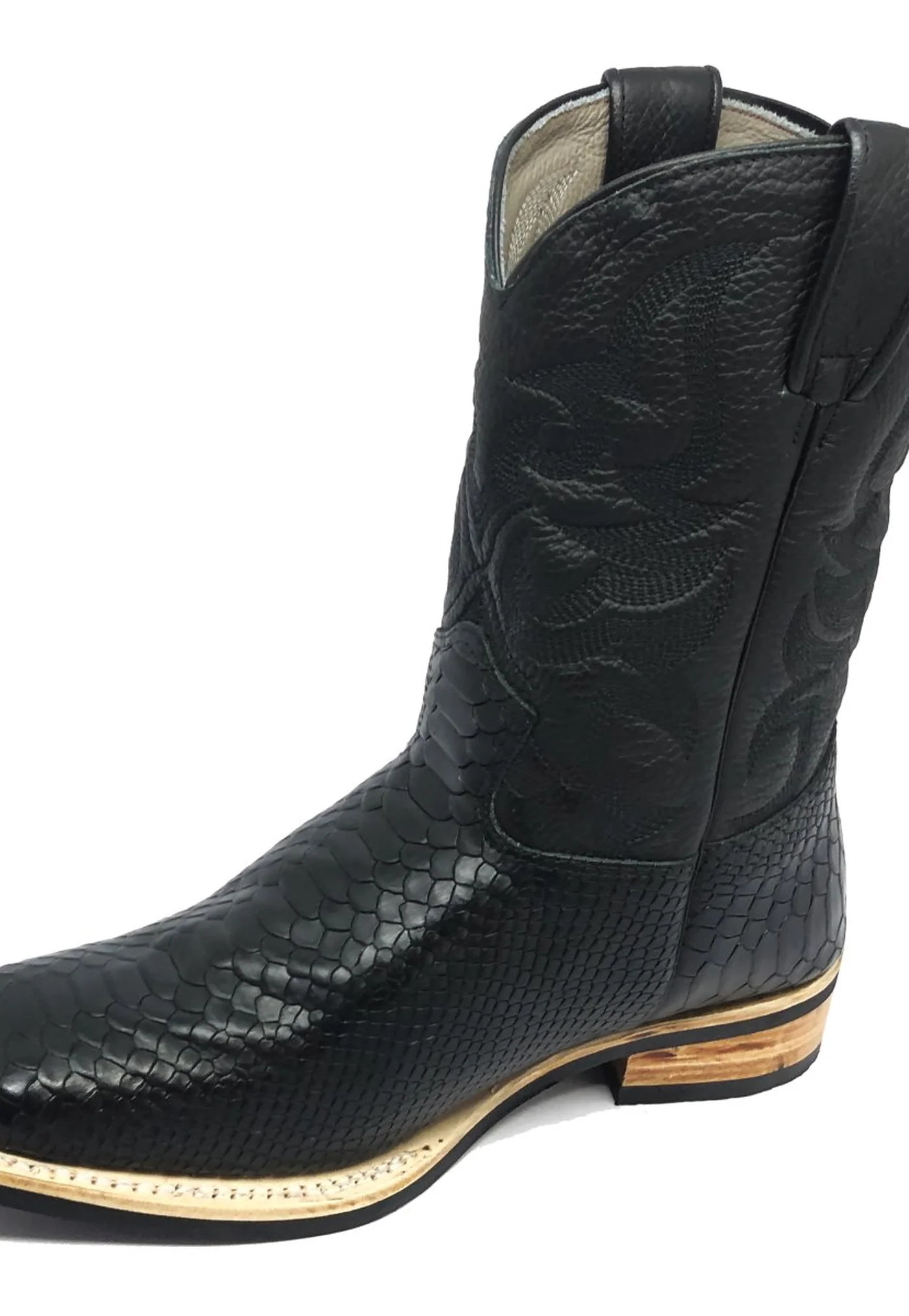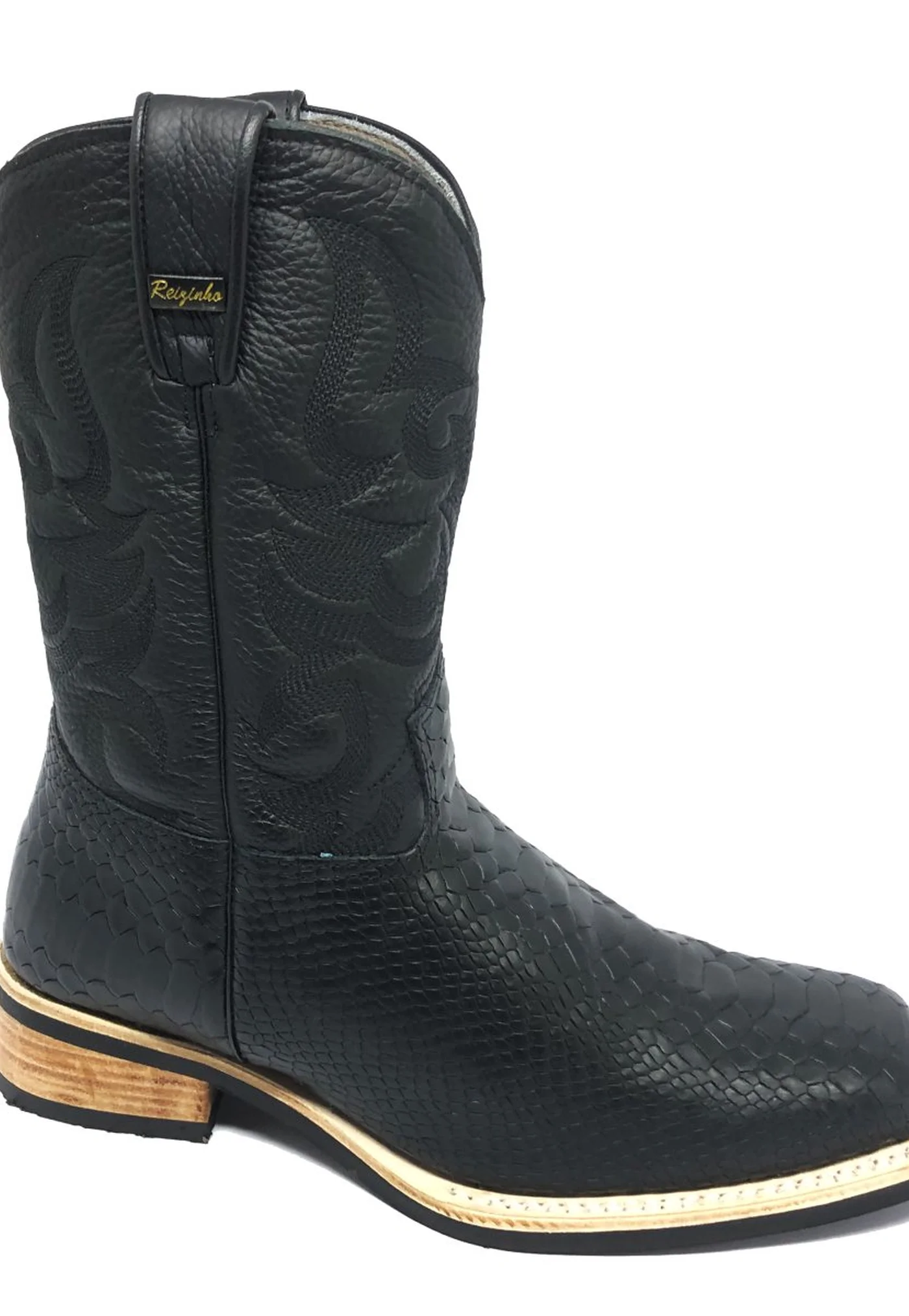 Bota de Couro Bovino Imitação de Cobra Preta - Cano Médio, Bico Quadrado, SOLADO X-FLEX ARTESANAL