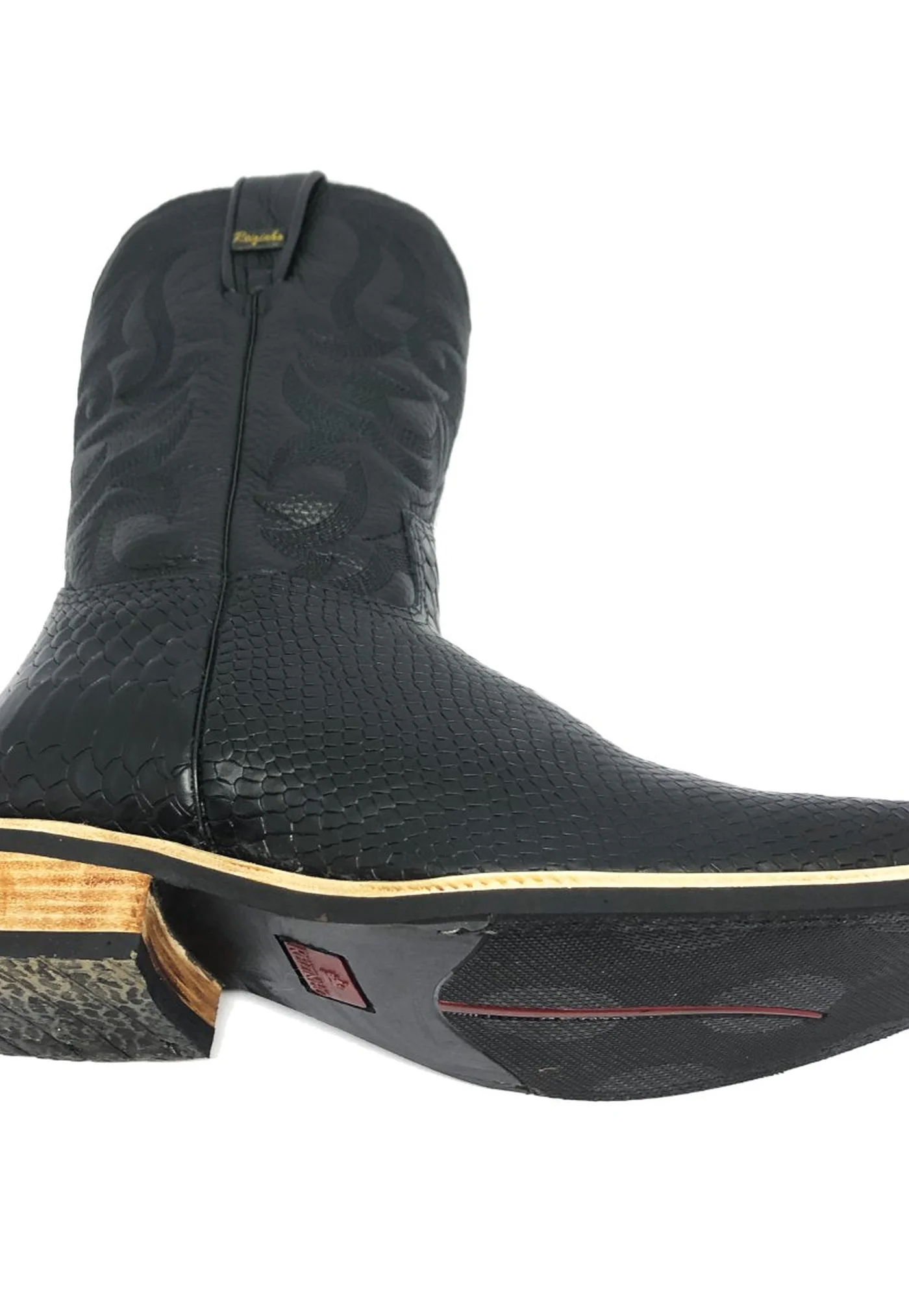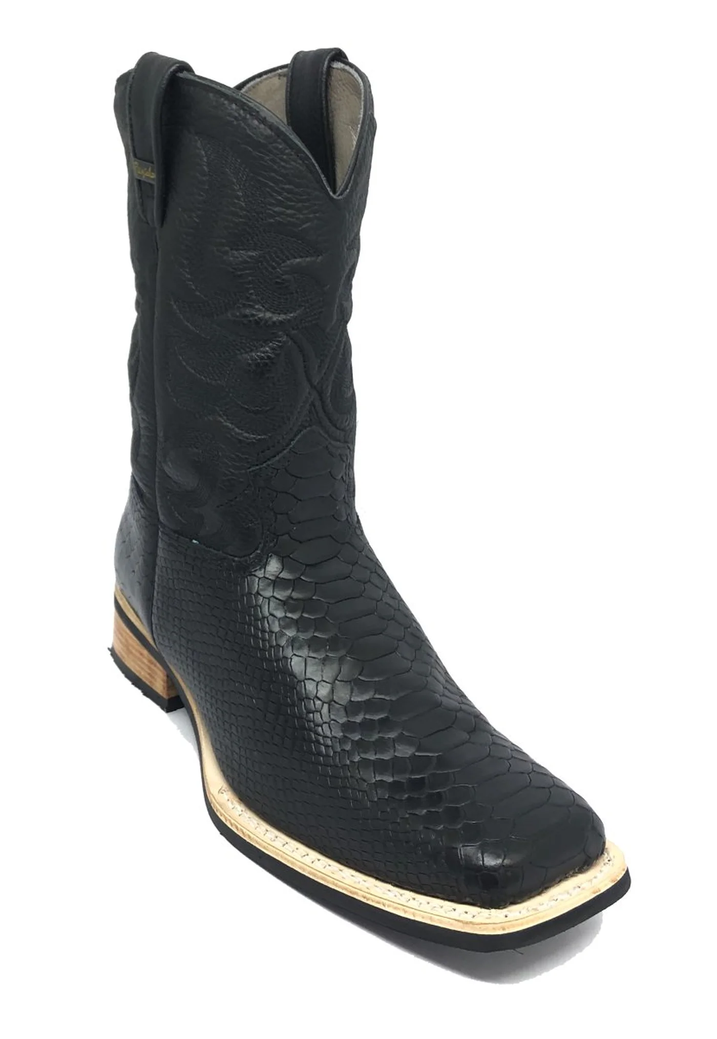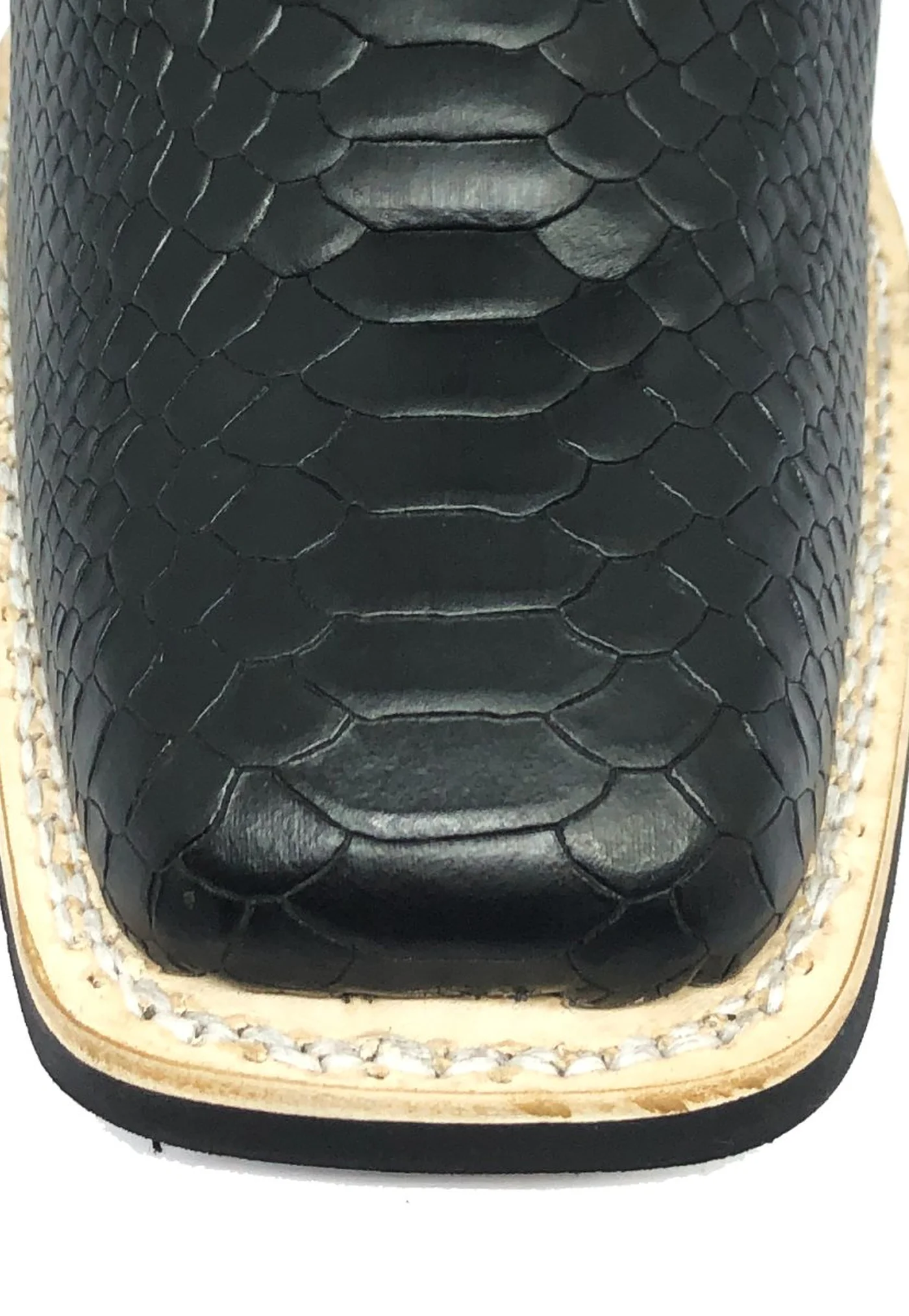 Bota de Couro Bovino Imitação de Cobra Preta - Cano Médio, Bico Quadrado, SOLADO X-FLEX ARTESANAL