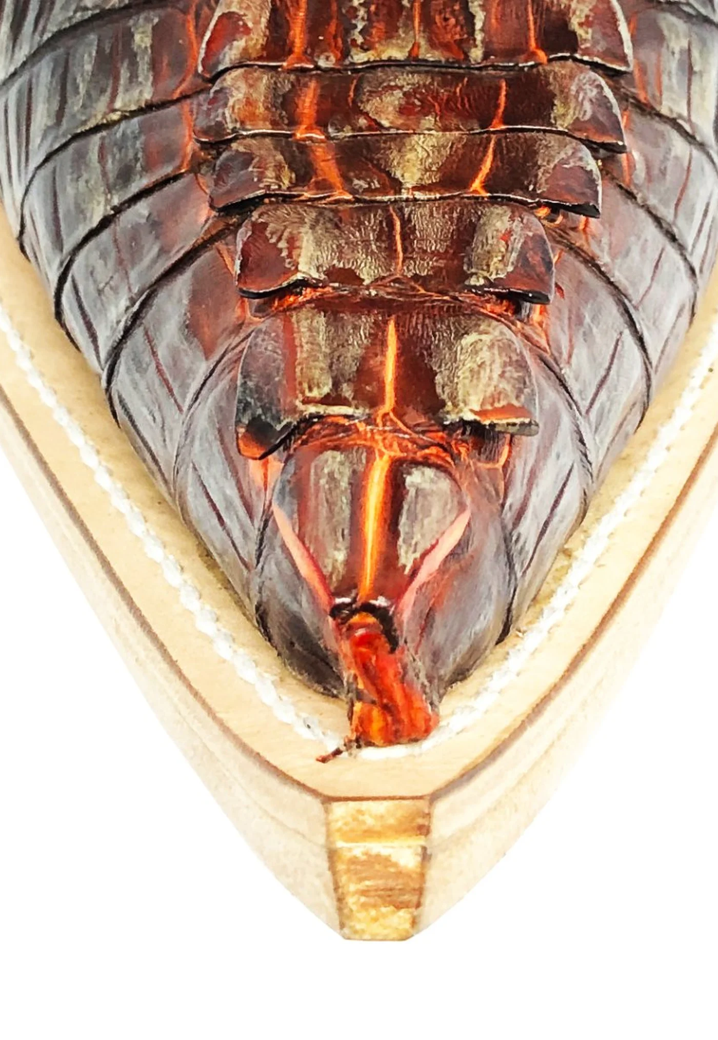 Cada bota é única, uma peça de arte que reflete a singularidade da natureza. Com o jacaré Darkness Orange e o corte exclusivo na Parte do Rabo, esta bota de Cano Alto, Bico Fino Inclinado e Solado de Couro Artesanal é uma afirmação de elegância arrojada.